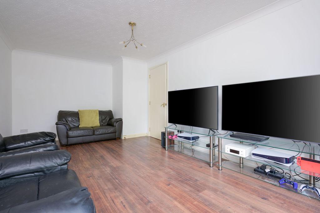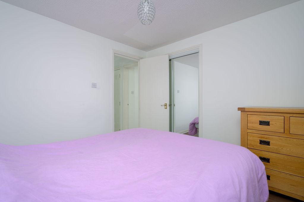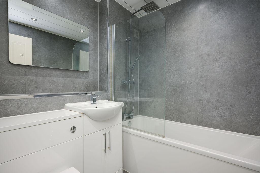 Both double bedrooms come with fitted wardrobes, ensuring ample storage space. The modern bathroom features a three-piece white suite with a shower over the bath, fitted vanity furniture, and a chrome heated towel rail.