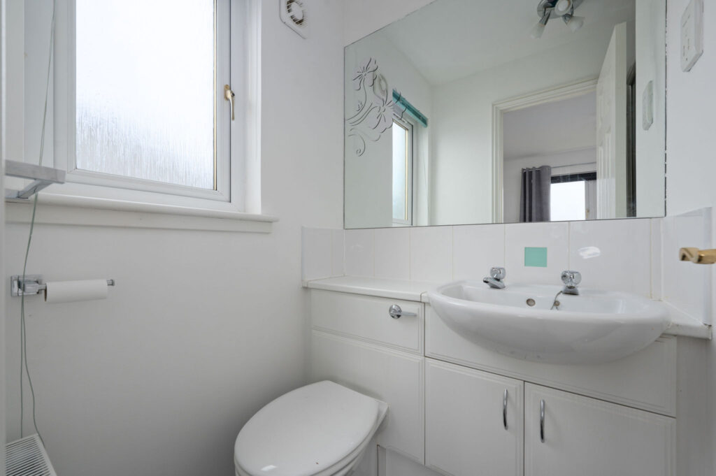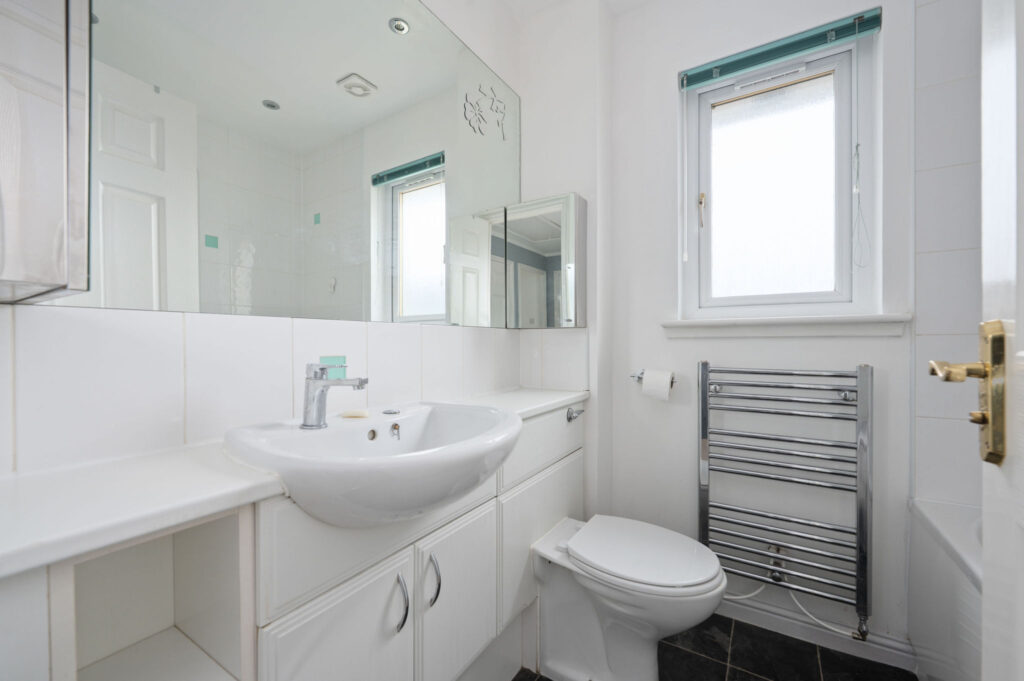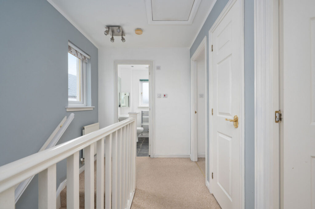 On the upper level, the master bedroom benefits from fitted wardrobes and a modern ensuite shower room, while two further well-proportioned bedrooms both include built-in cupboards. The accommodation is completed by a family bathroom with vanity furniture and a chrome heated towel rail, along with a useful landing cupboard.