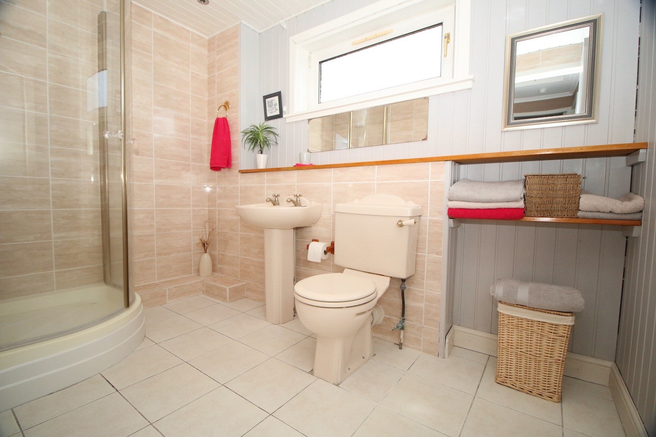 On the upper level are 3 well appointed bedrooms and bathroom. The bathroom offers a modern white shower suite with contemporary wall and floor tiling.