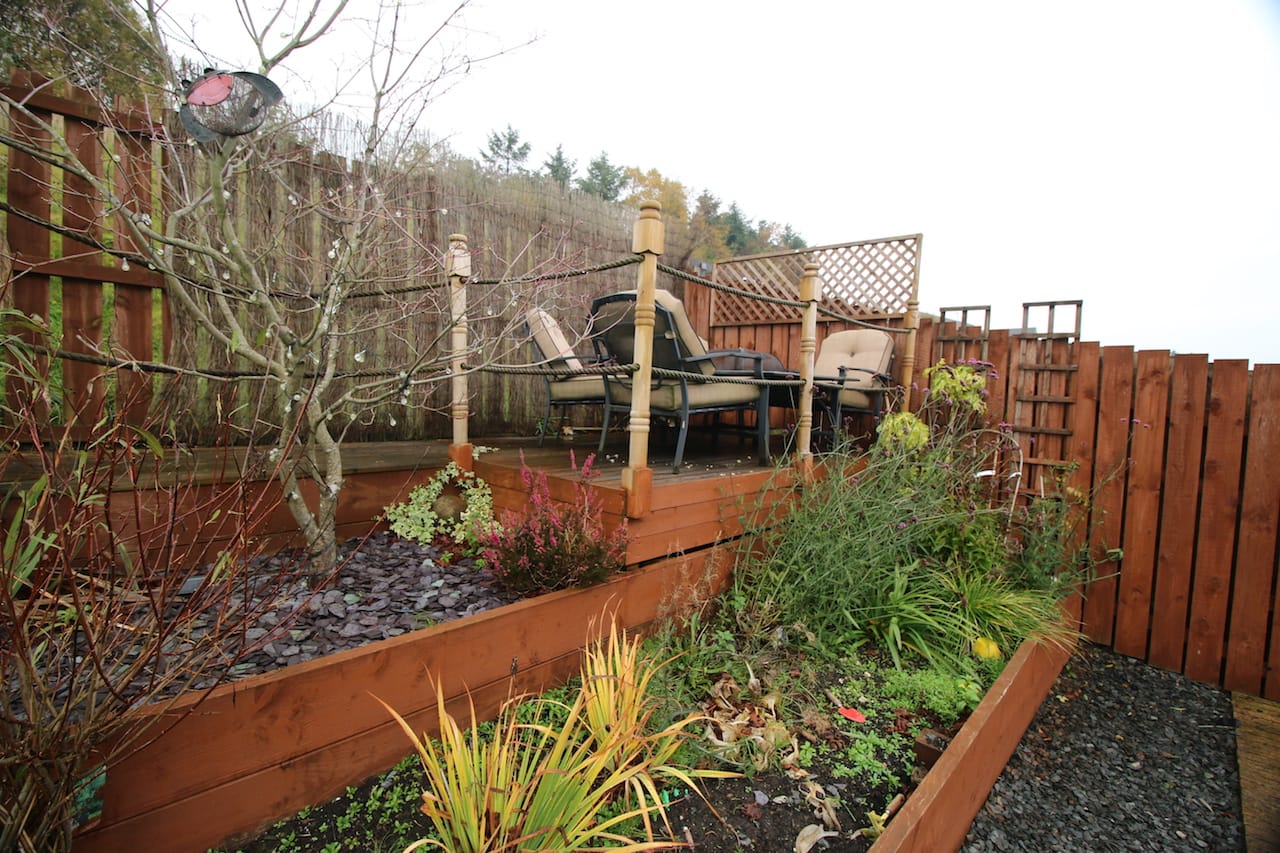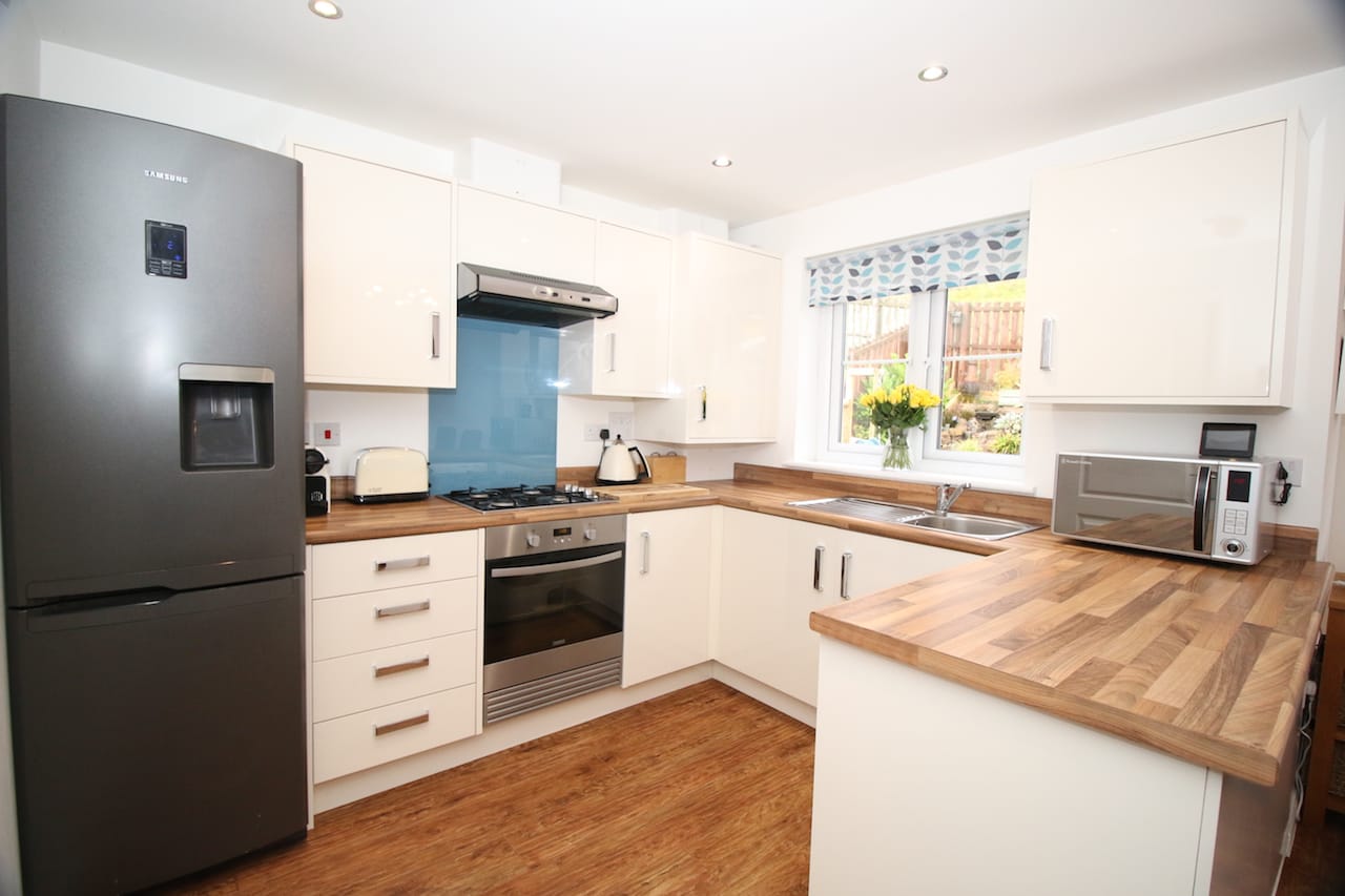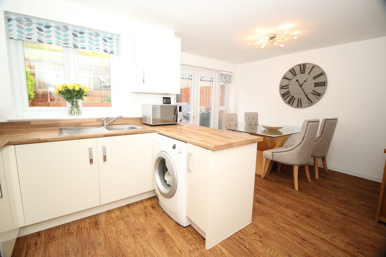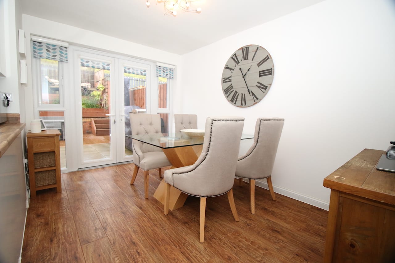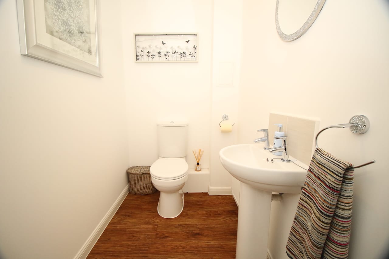 You will be immediately impressed with the open plan, contemporary kitchen and dining which offers a fantastic space for relaxing and entertaining.  It is stylish and spacious, boasting a good range of base and wall units, and with space for dining it is perfect for family mealtimes or entertaining.  Leading from the kitchen is the recently landscaped garden which offers decking areas and lawn with boxed areas stocked with shrubs.  The front facing lounge features a box bay window, which floods the room with natural light.  On the lower floor there is also a convenient WC..