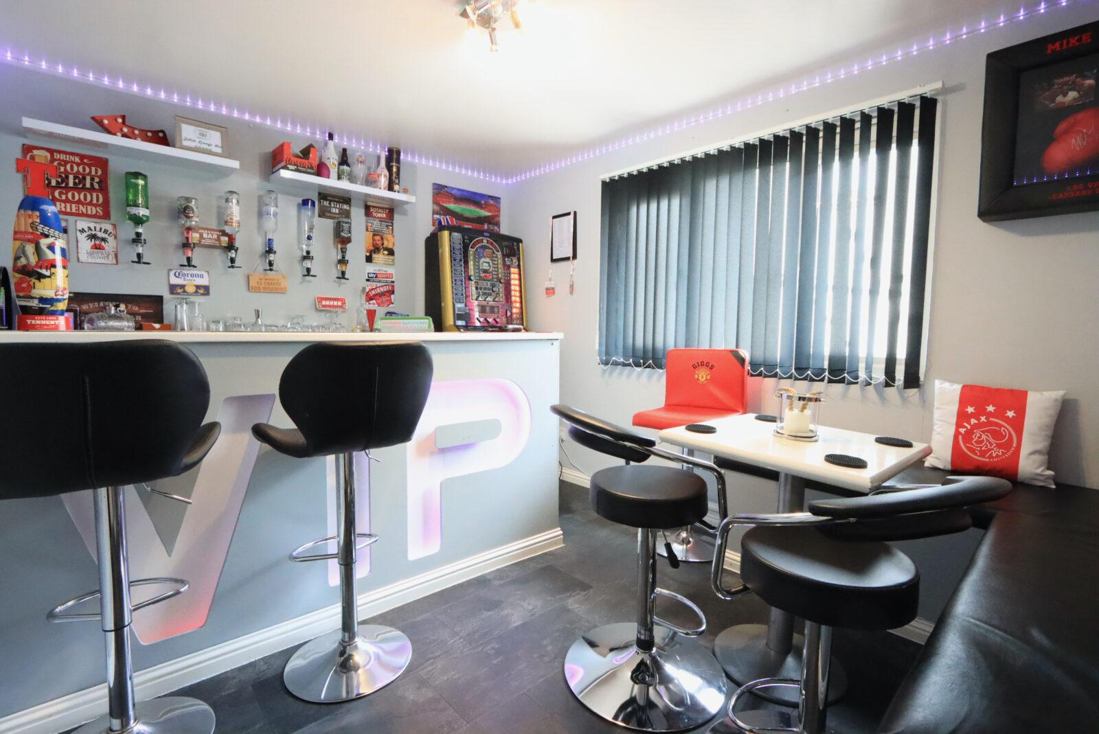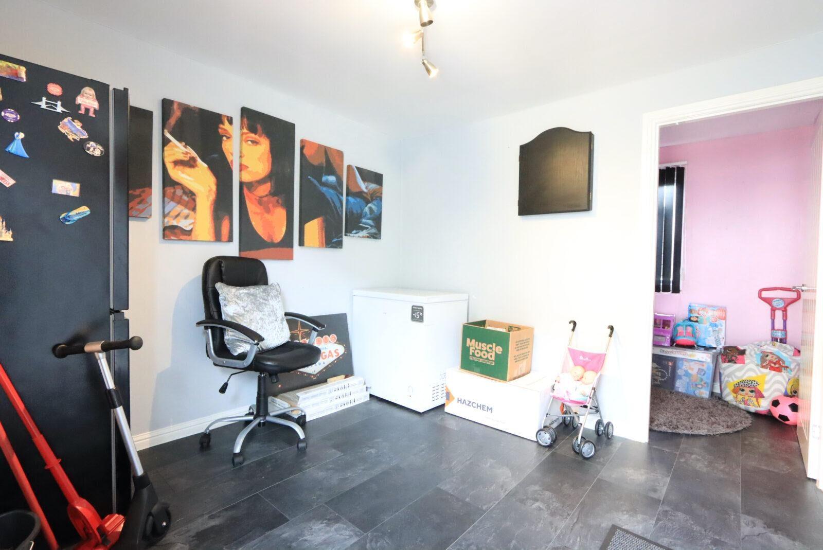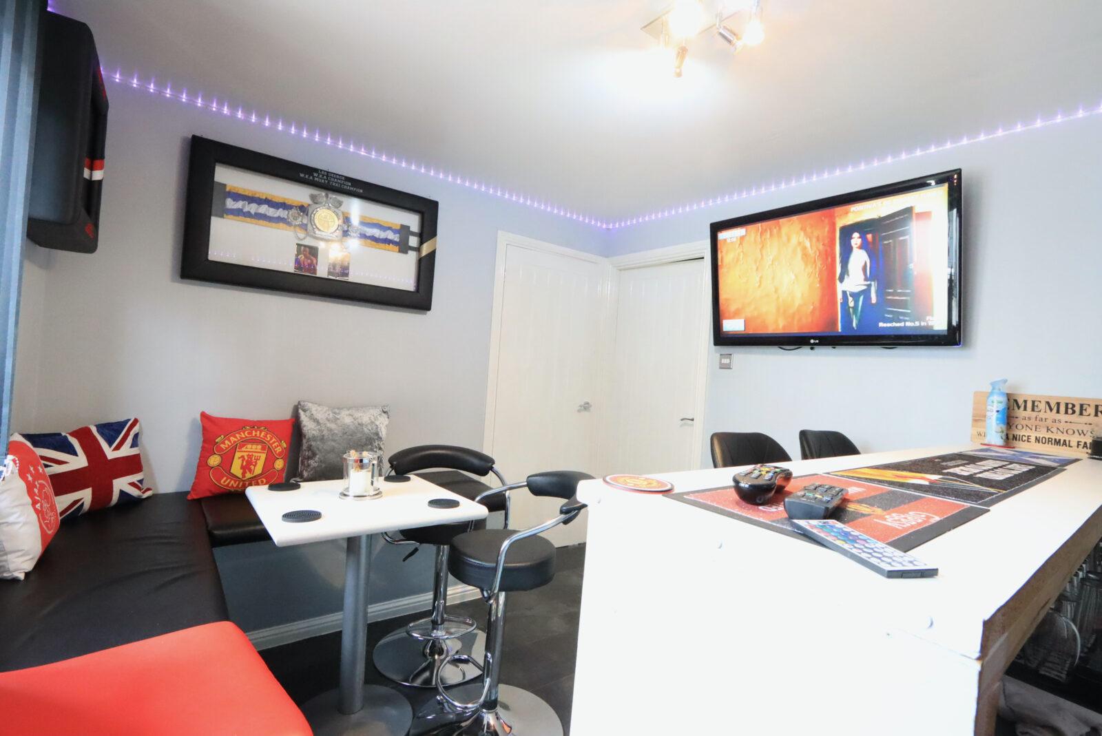 The front facing lounge creates a relaxing atmosphere for entertaining or family living and flows to the kitchen dining area. The modern fitted kitchen enjoys ample base and wall units, complete with integrated oven hob and hood. There is space for dining, ideal for family mealtimes. The low maintenance rear garden offers a large patio area, the perfect spot for outdoor entertaining or to enjoy a summer BBQ. The fabulous outbuilding which hosts large utility space/home office, a playroom, a fully fitted bar and large pantry, a fabulous addition to this beautiful property.