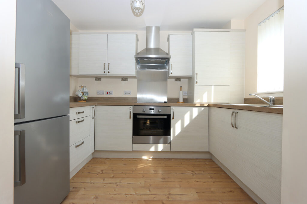 As you enter the lounge, you will be immediately impressed with the open plan living, a perfect space for family living or entertaining. A striking corner window affords an open outlook whilst flooding the room with natural light. The modern fitted kitchen has been well equipped with a good range of base and wall units and comes complete with ceramic hob, integrated washer dryer and fridge freezer.