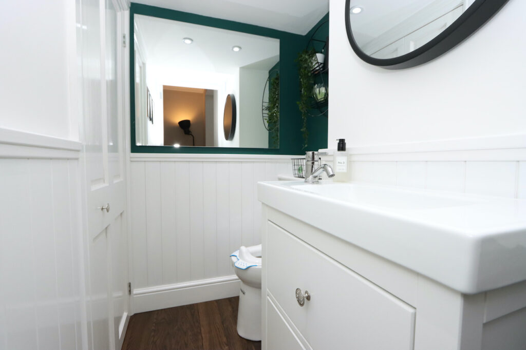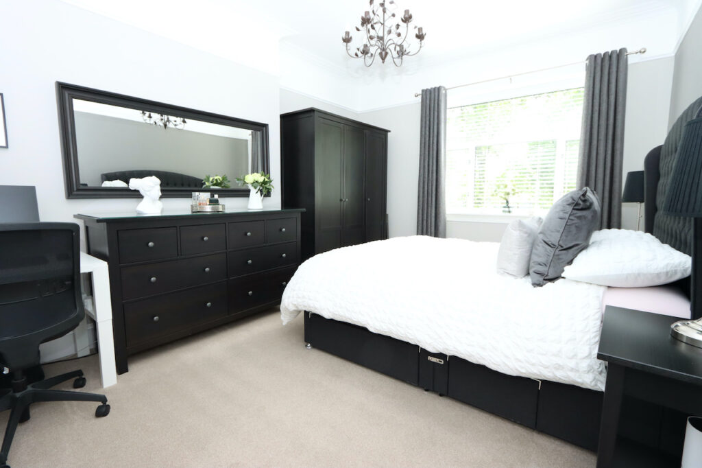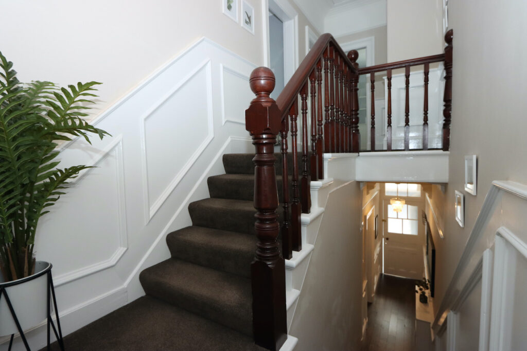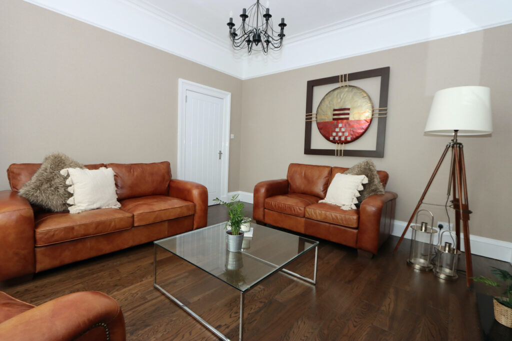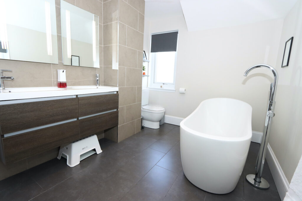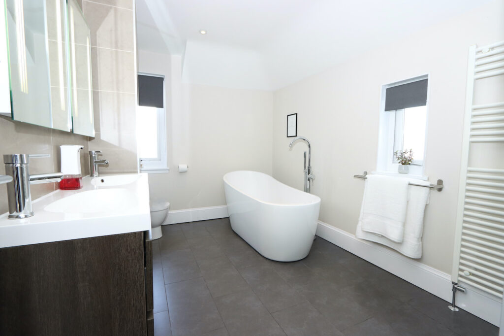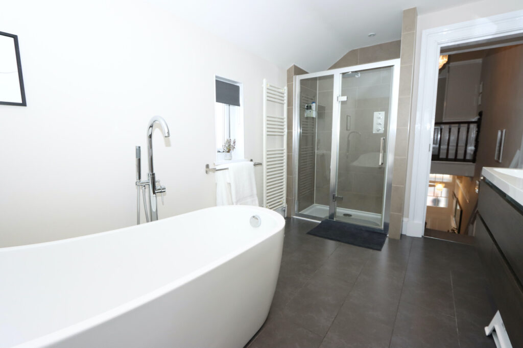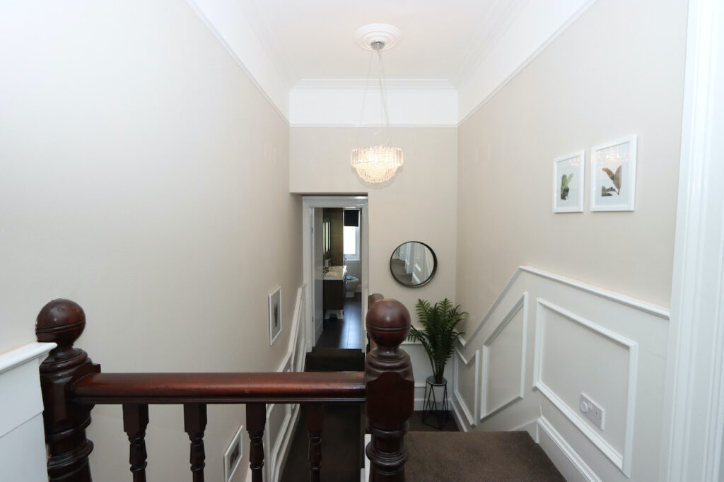 Upstairs, the mid-level landing accommodates the show-stopping family bathroom which enjoys a freestanding bath tub, double shower enclosure, double wash basin with fitted vanity furniture, WC and towel warmer. The top landing boasts two further double bedrooms and a well-proportioned single bedroom.