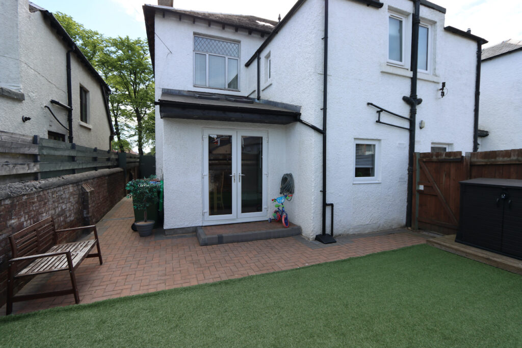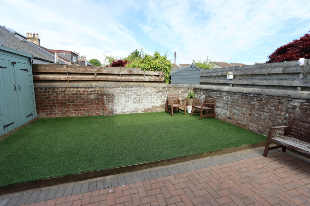 The walled rear garden has been recently redesigned for minimal maintenance and includes artificial lawn and garden sheds.