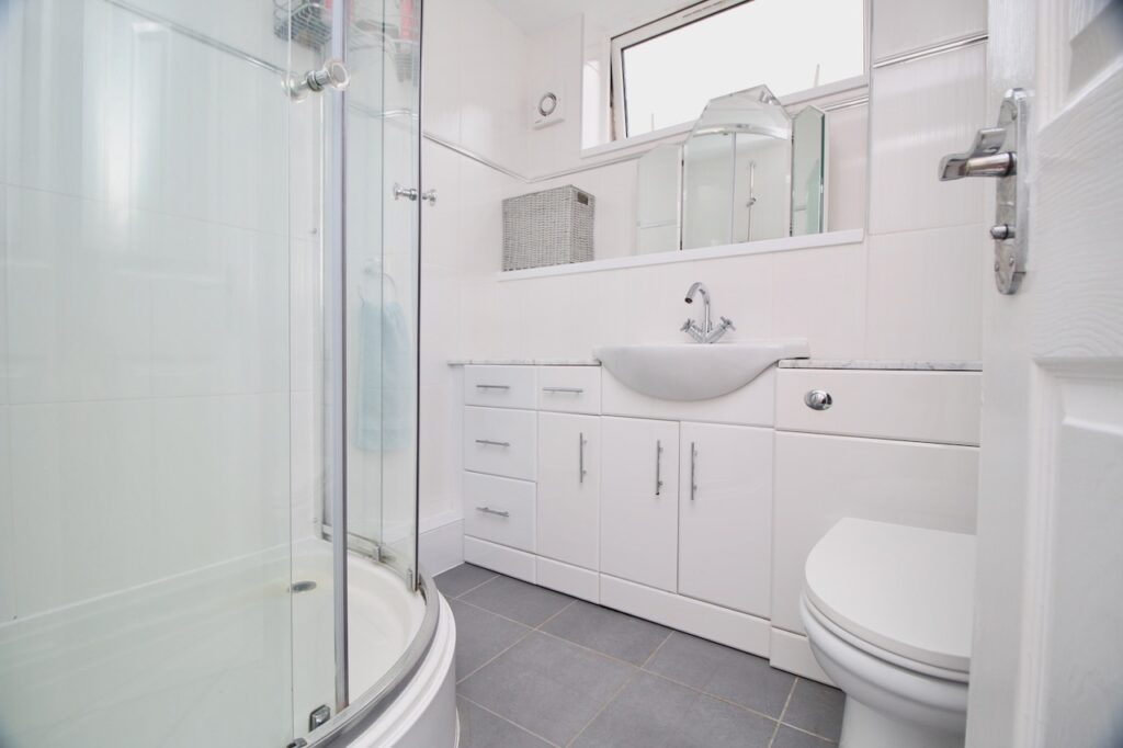 On the lower level the hallway leads to two double bedrooms both with their own wardrobe storage and family shower room. The family shower room is complete with WC, wash basin, double corner shower cubicle compete with white gloss vanity furniture and ceramic tiling throughout.
