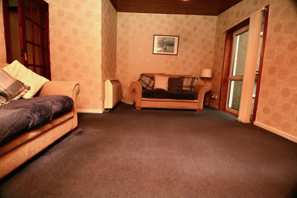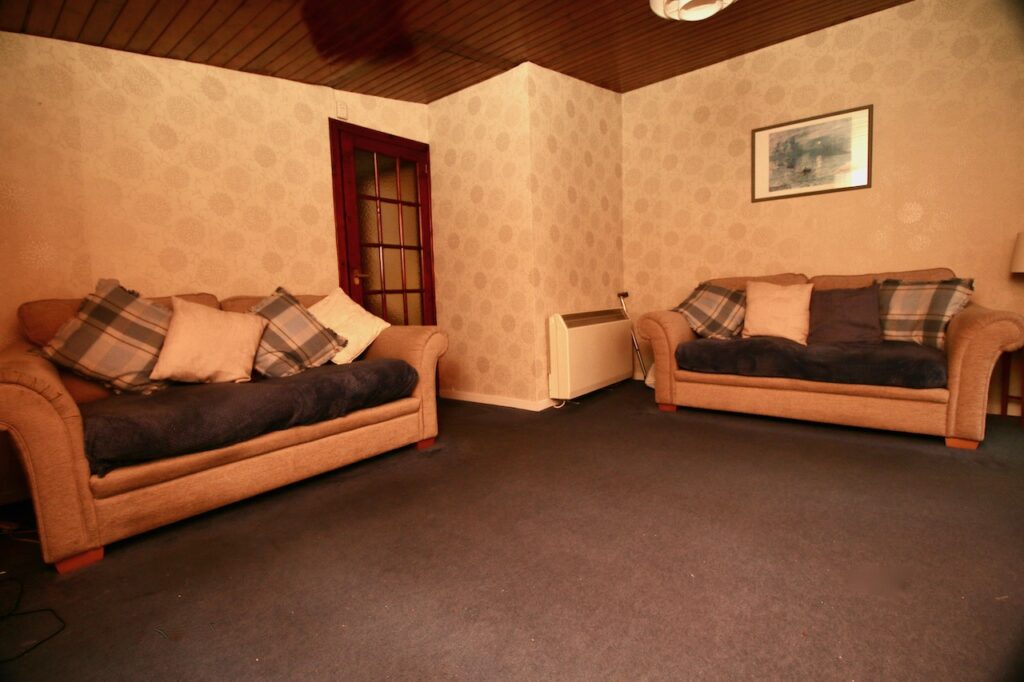 On the lower level the hallway leads to two well proportioned bedrooms and family bathroom. The family bathroom is complete with WC, wash basin, bath and overhead electric shower.