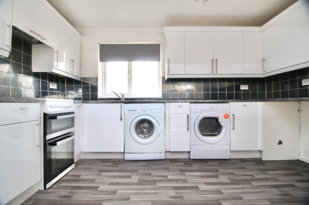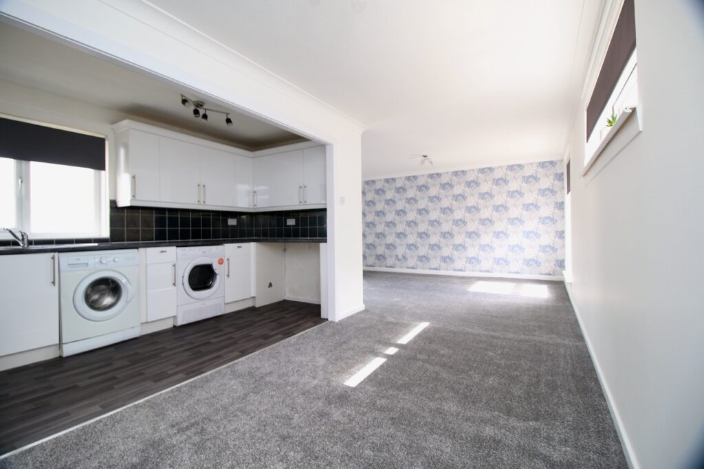 The inviting hallway provides access to all accommodations on offer and the property also boasts excellent storage. As you enter the open plan lounge/dining area you will be immediately impressed by the size of room with large dual aspect double glazed windows which flood the room with natural light. This area is the perfect space for family mealtimes or entertaining. The kitchen has been fitted with an excellent range of base and wall units which are finished in high gloss white doors with washing machine, tumble dryer and oven all included in the sale.