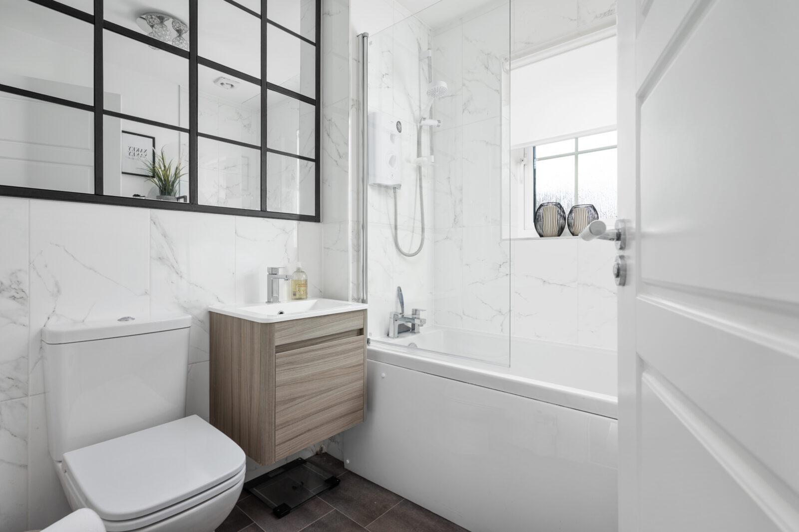 The family bathroom includes: bath, overhead shower, floating wash basin, WC, finished with marble tiling and vanity furniture.