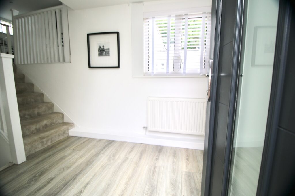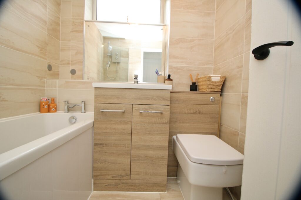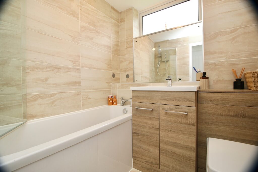 On the lower level the hallway leads to two double bedrooms which are of a generous size and pleasing to be in and both benefit from new wardrobe storage. The recently remodelled family bathroom is complete with WC, wash basin, bath, overhead shower finished with floor to ceiling wall tiling, vanity furniture and chrome accessories.