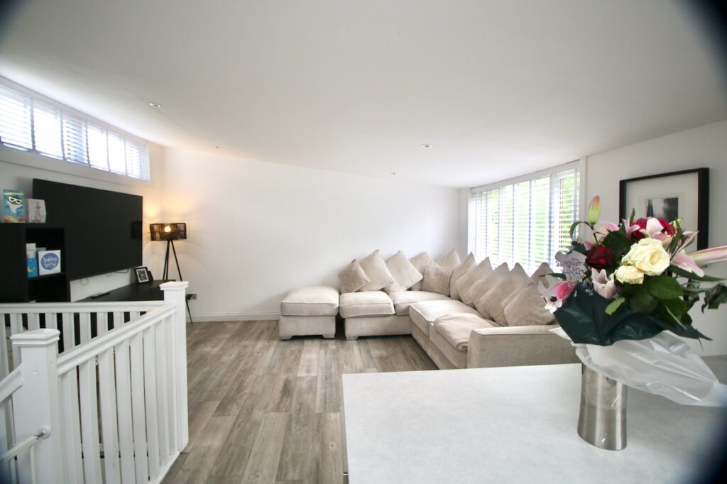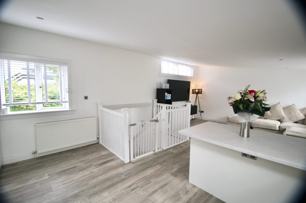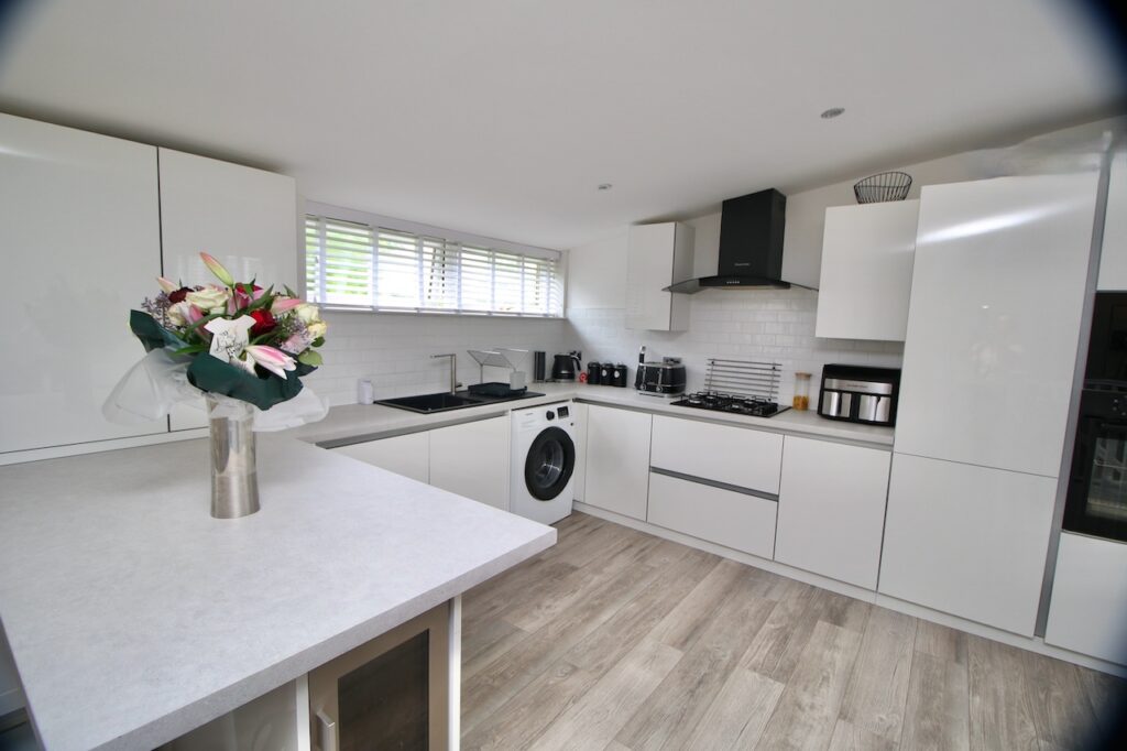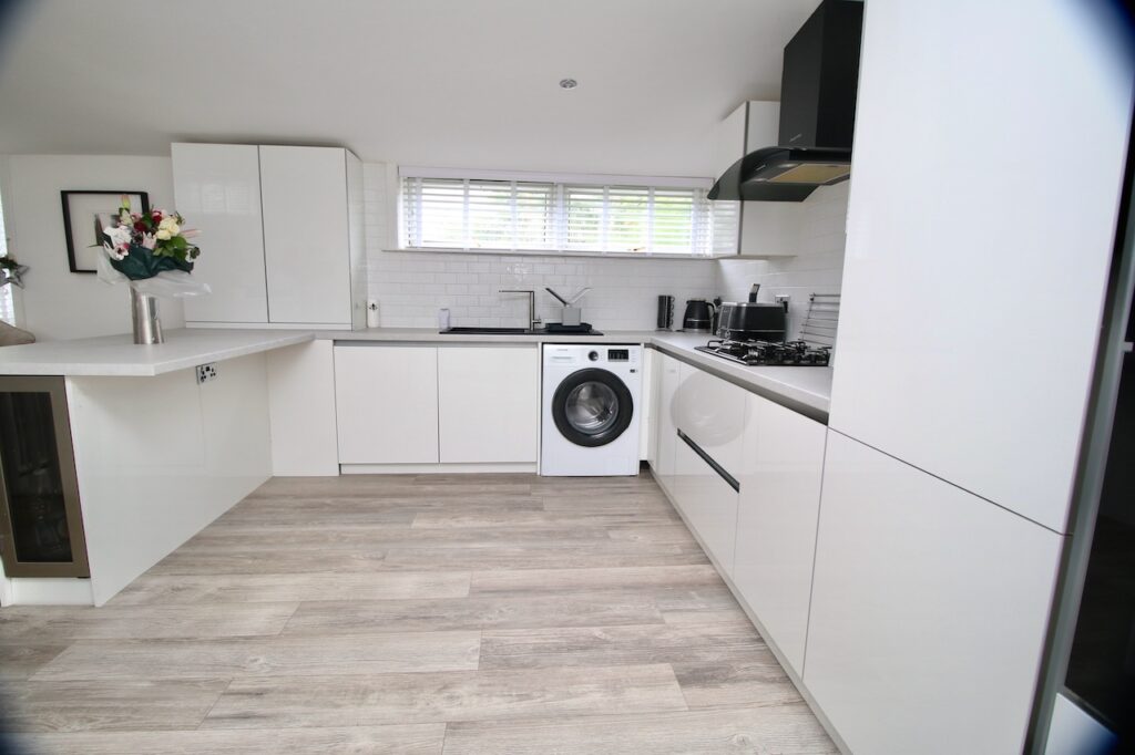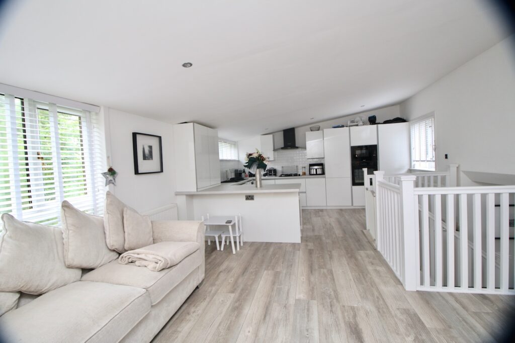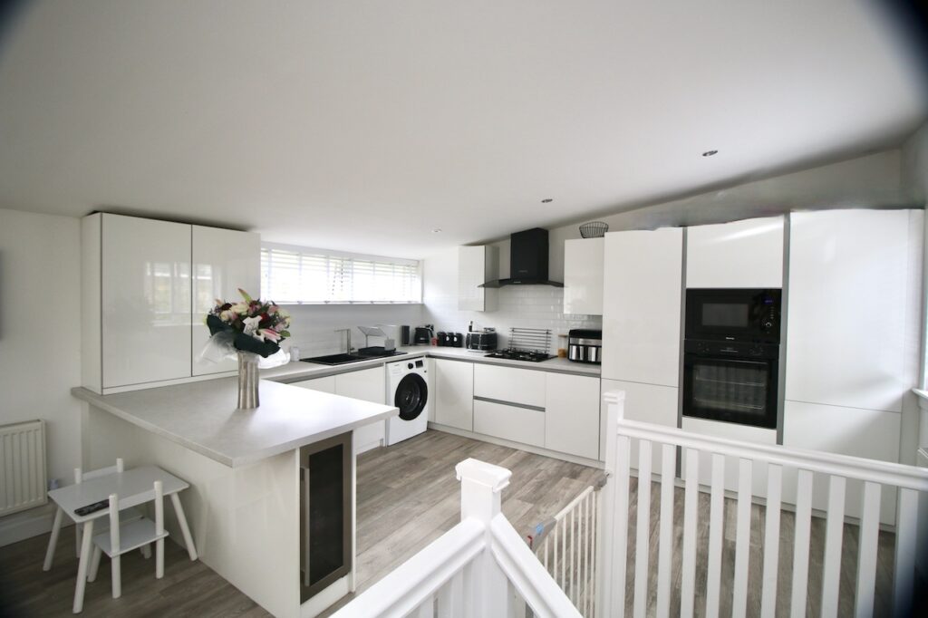 The bright entrance hall provides access to all accommodations on the upper and lower floor. On the upper floor you will be immediately impressed with open plan living/kitchen/dining area complete large double glazed windows which flood the entire room with natural light finished with contemporary interiors. The brand new kitchen is well equipped with an excellent range of base and wall units complete with gas hob, oven, build in microwave, integrated fridge/freezer, washing machine and wine cooler which are all included in the sale. The kitchen also has a breakfast bar and space for informal dining and is finished with white gloss doors, feature wall tiling and black accessories.