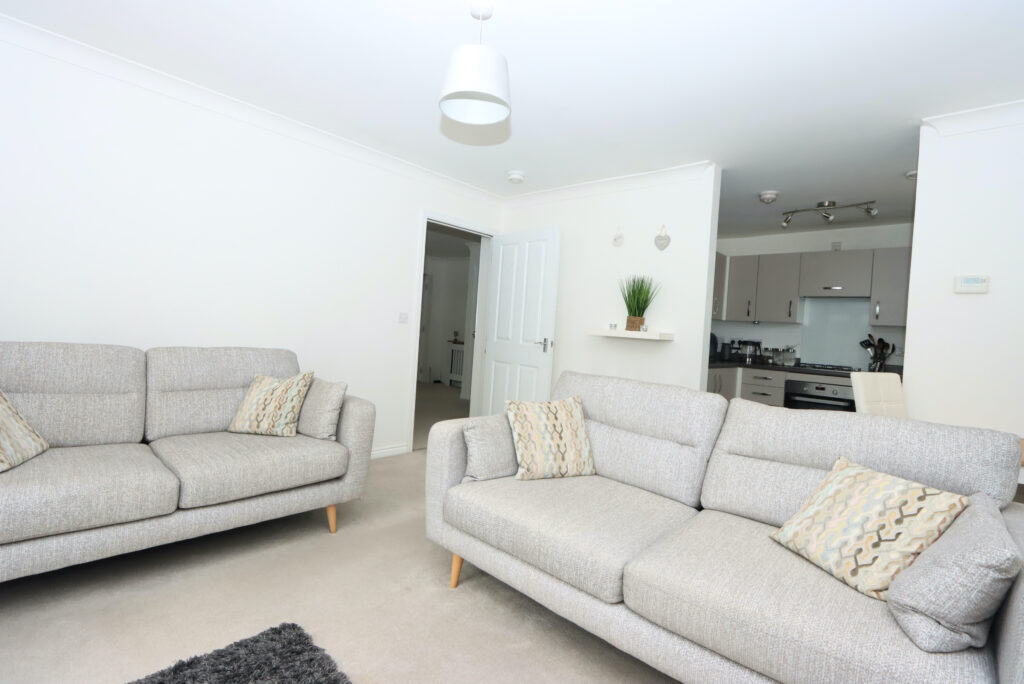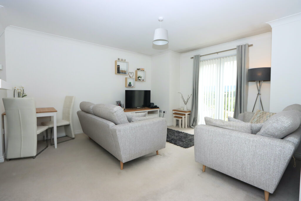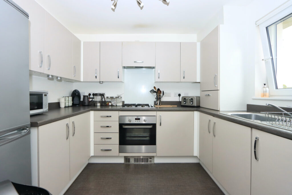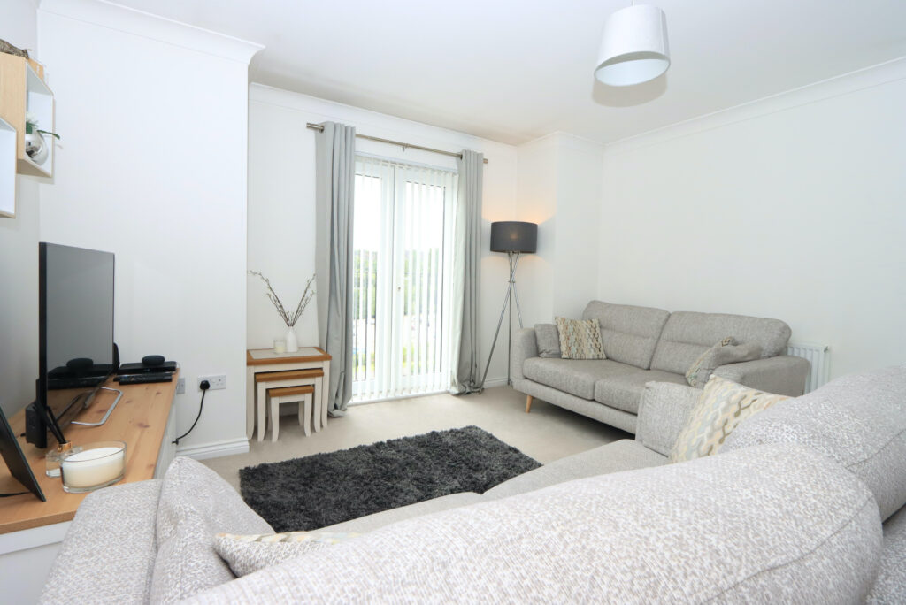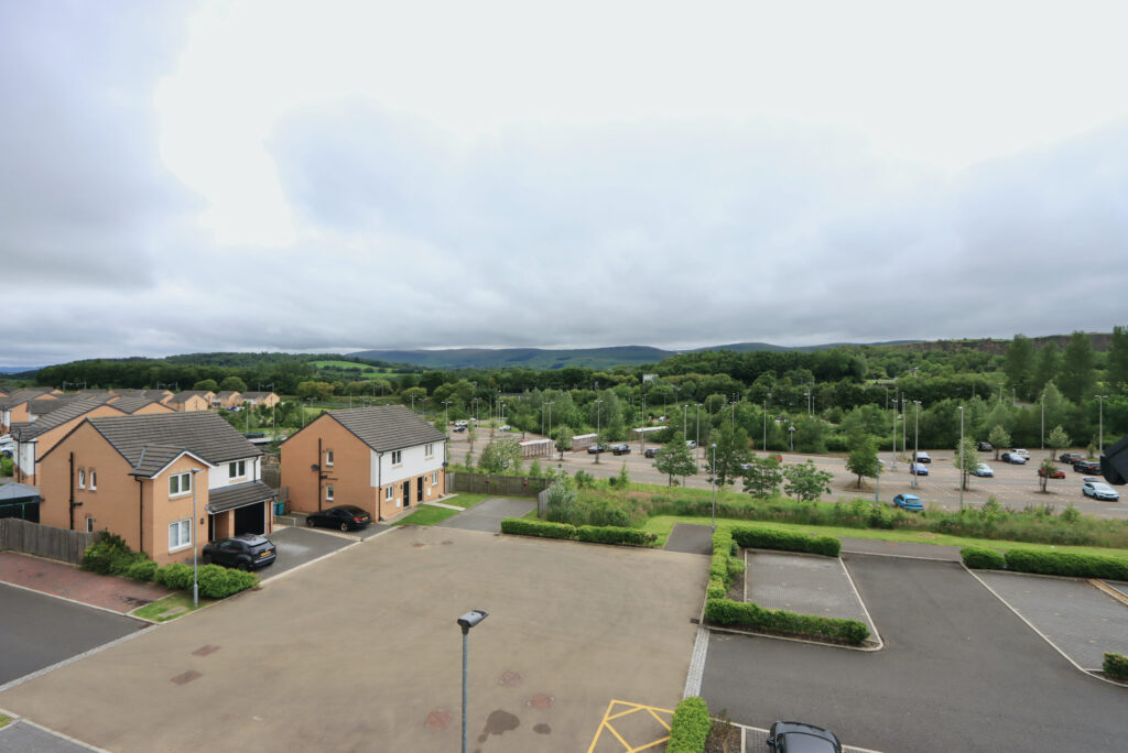 As you enter property, you will be immediately impressed with the welcome hallway with contemporary internal doors and neutral decor. Open plan living with large lounge/dining/kitchen, perfect for entertaining. Beautiful Juliet balcony flood the room with natural light, whilst enjoying open views towards the Campsie Hills. The modern fitted kitchen has been well equipped with a good range of base and wall units and comes complete with oven, hob and hood, integrated washer/dryer and freestanding fridge freezer.