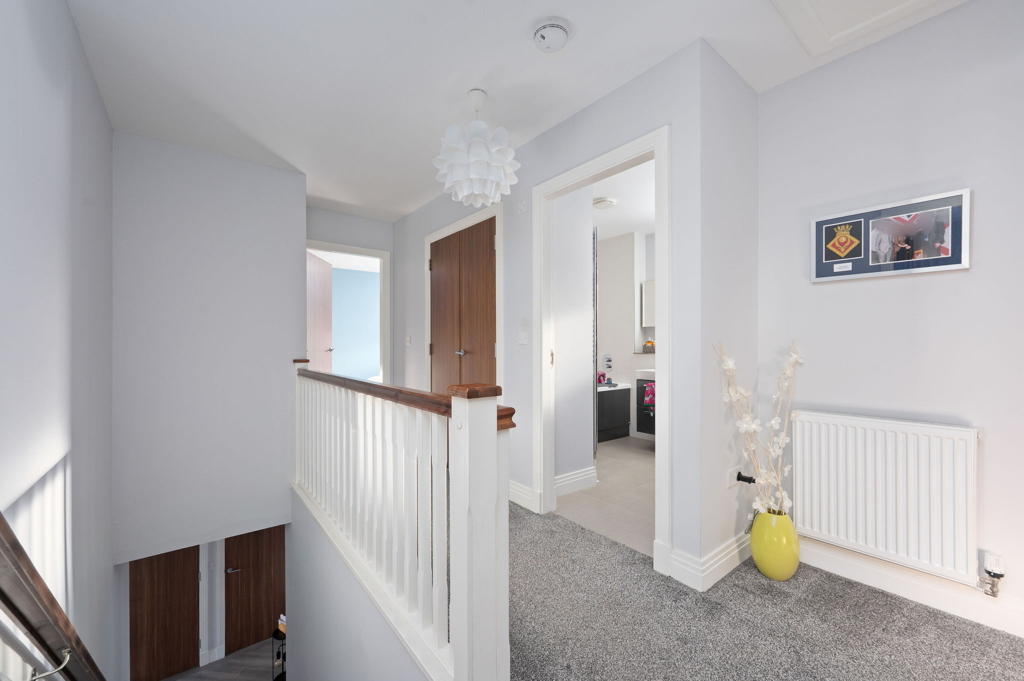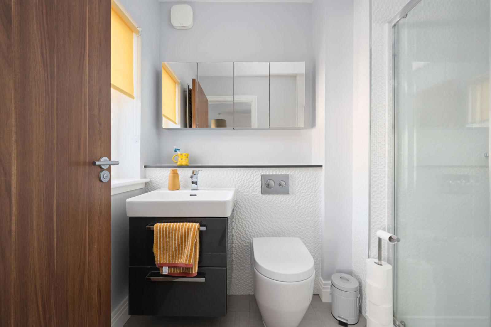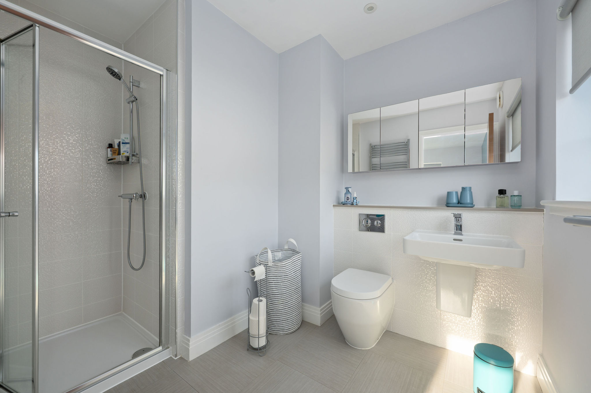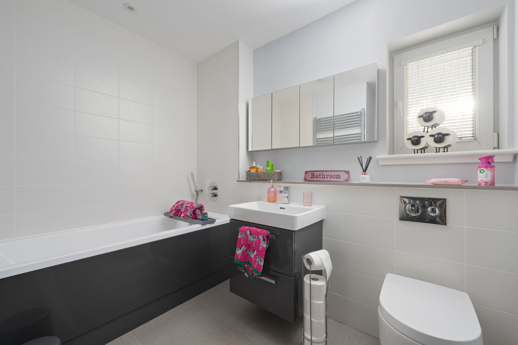 The contemporary family bathroom comes complete with floor to ceiling ceramic tiling, separate shower cubicle, WC, wash basin, bath with granite gloss vanity furniture, feature mirror and chrome heated towel rail.