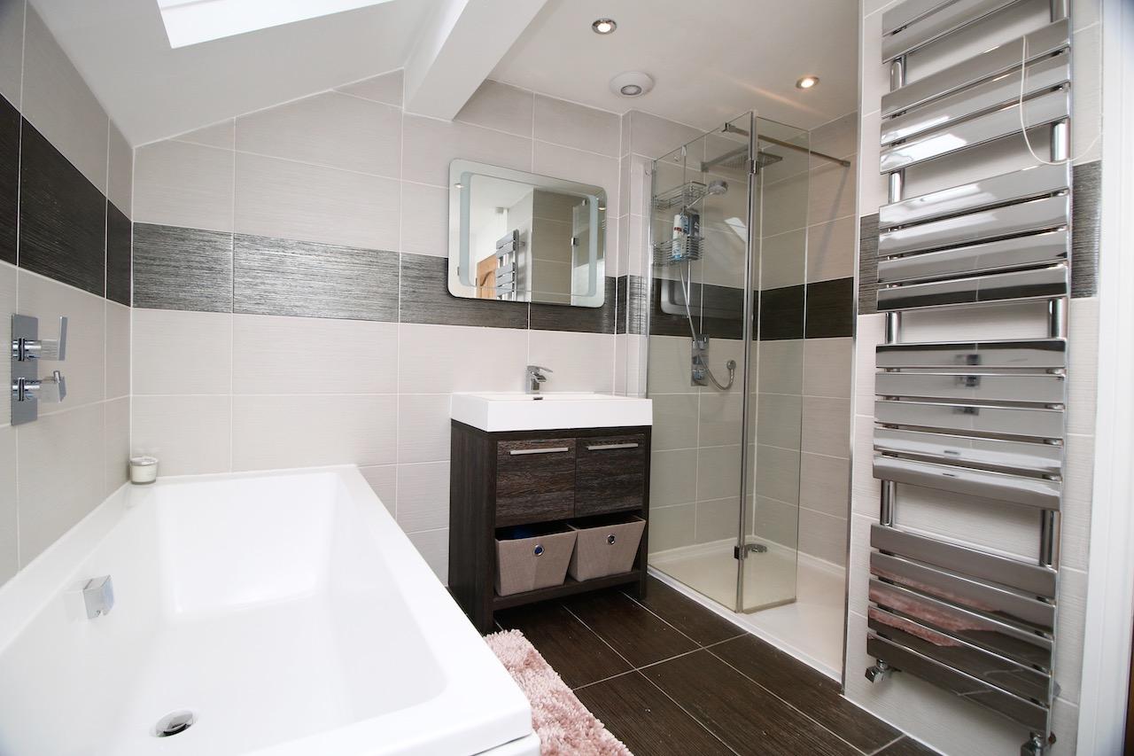 The glass bannister leads to the upper level hallway which has three bedrooms all of good size and pleasing to be in.The family bathroom has been recently upgraded and extended and provides full height porcelanosa wall tiling with matching floor tiles, separate double shower cubicle, overhead waterfall shower, white bath and walnut style vanity furniture.