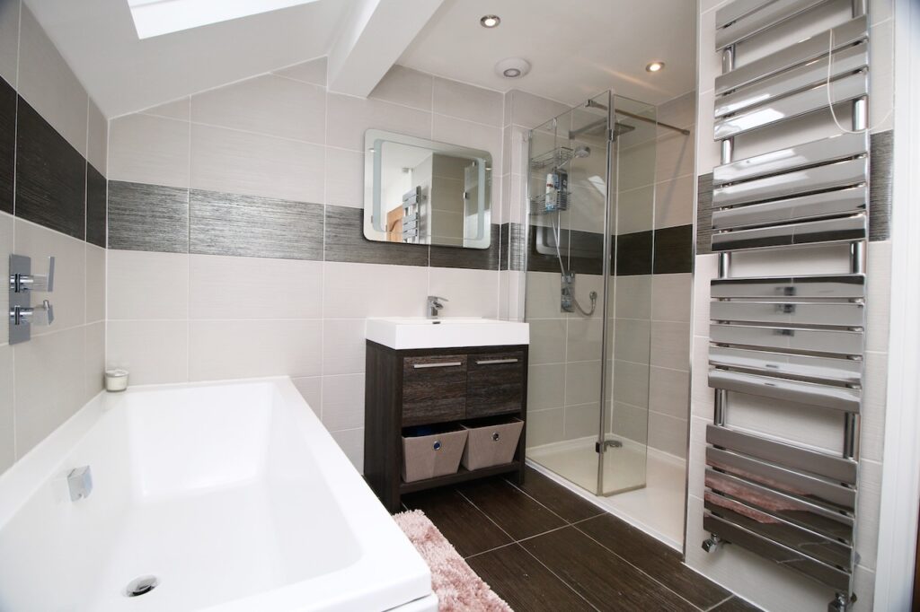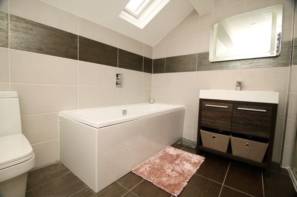 The glass bannister leads to the upper level hallway which has three bedrooms all of good size and pleasing to be in. The family bathroom has been recently upgraded and extended and provides full height porcelanosa wall tiling with matching floor tiles, separate double shower cubicle, overhead waterfall shower, white bath and walnut style vanity furniture.