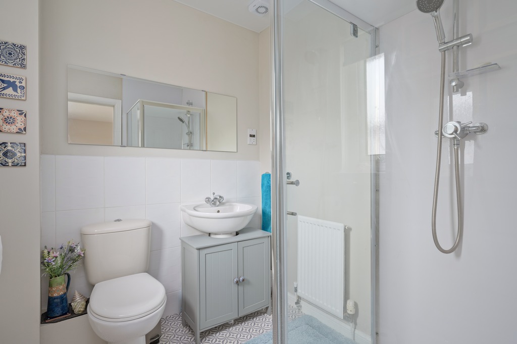 Upstairs, the master bedroom offers a peaceful sanctuary with fitted wardrobes and a private ensuite bathroom. Three additional well-proportioned bedrooms, each equipped with fitted wardrobes, provide ample storage, making this property ideal for a growing family. A family bathroom with a shower over the bath serves the remaining bedrooms.