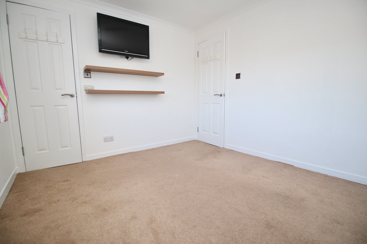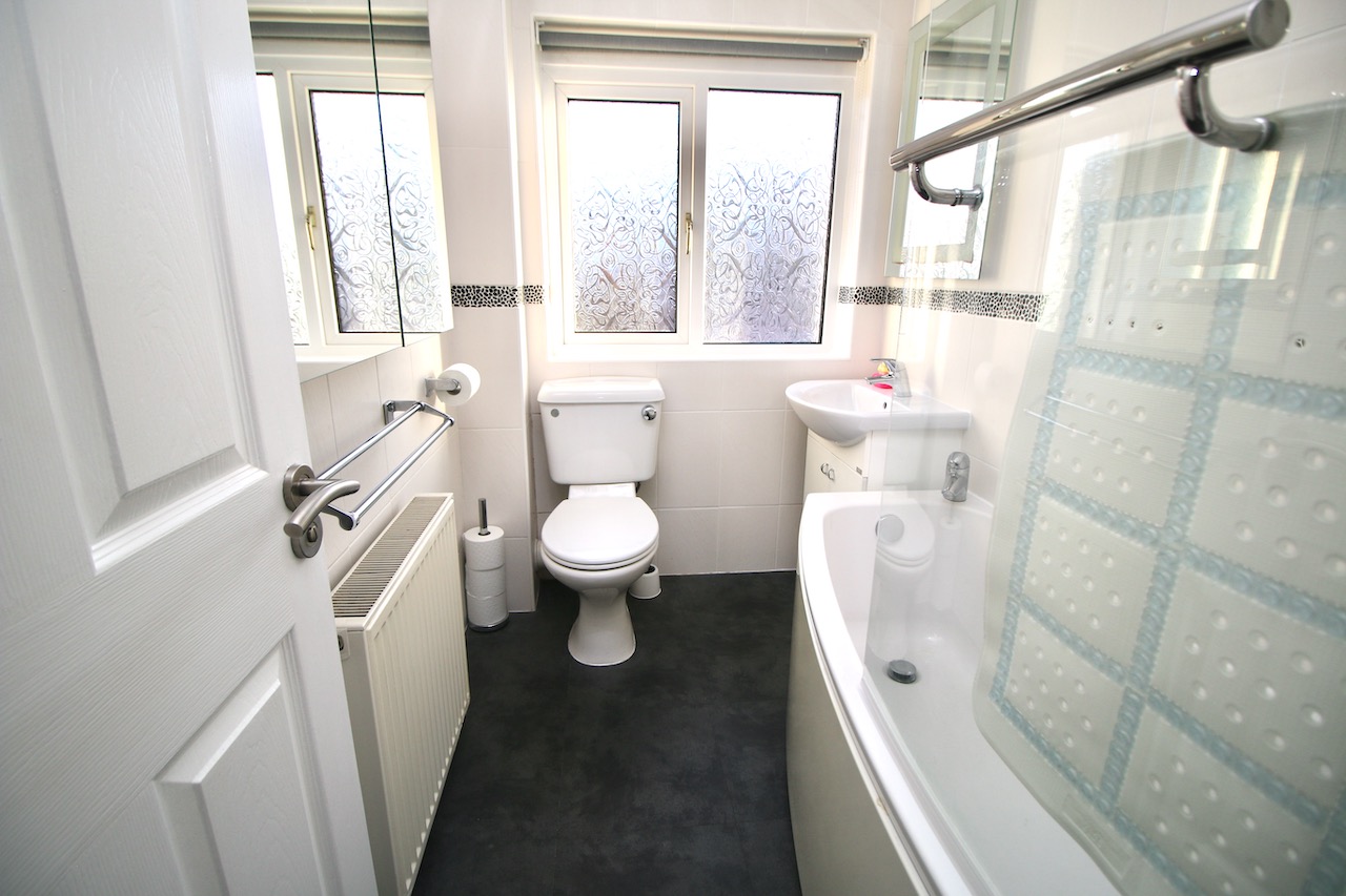 On the upper level the hallway leads to two double bedrooms which are generous in size and both have their own wardrobe storage.  The modern family bathroom is complete with WC, wash basin, bath, overhead shower finished with white gloss vanity furniture, full height wall tiling and chrome accessories.