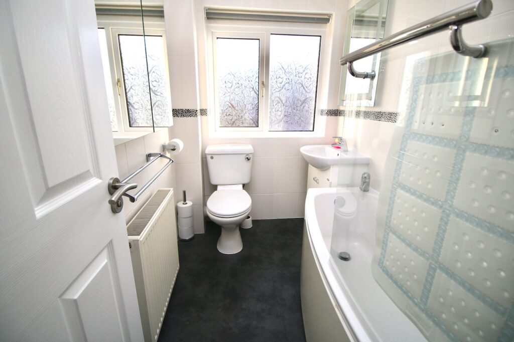 On the upper level the hallway leads to two double bedrooms which are generous in size and both have their own wardrobe storage. The modern family bathroom is complete with WC, wash basin, bath, overhead shower finished with white gloss vanity furniture, full height wall tiling and chrome accessories.