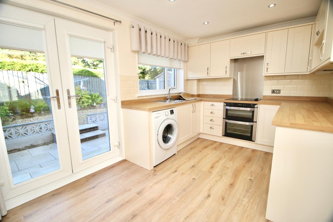 As you enter the property you are welcomed by the entrance vestibule which leads to all accommodations on the lower and upper floor.  The bright front facing lounge is sure to impress by the generous proportion of the room complete with feature fireplace and beautiful French doors which lead into the kitchen.  The contemporary kitchen has been fitted with an excellent range of base and wall units complete with hob, double oven, washing machine, integrated appliances include fridge and freezer which are all included in the sale. The kitchen is finished with latte gloss doors, chrome accessories and brick effect ceramic tiling.  The dining area is the perfect place for family mealtimes or entertaining with fabulous French doors which access the rear garden and garage.
