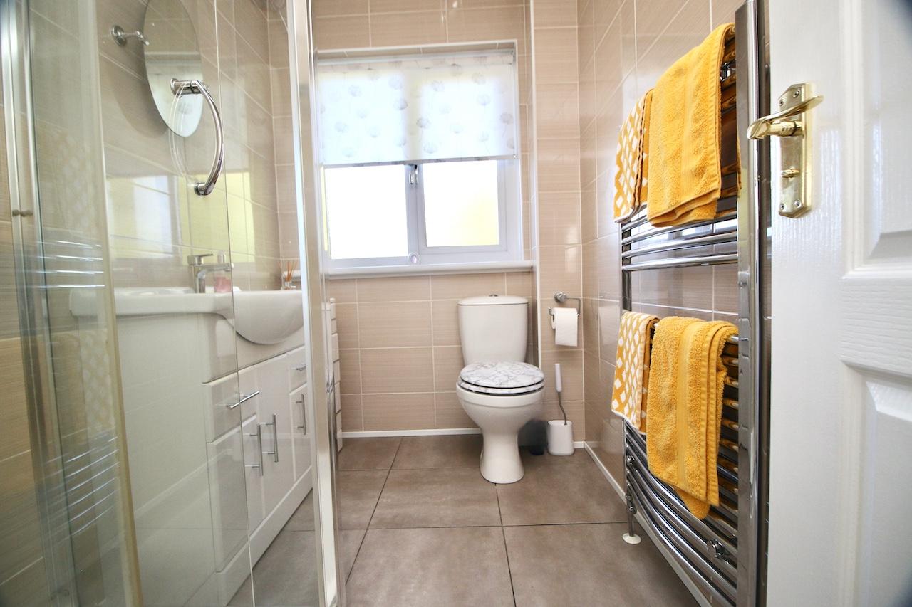 On the upper level the hallway leads to two double bedrooms which are generous in size and both have their own wardrobe storage.   The modern shower room is complete with double walk in shower cubicle, WC, wash basin, white vanity furniture and stunning full height wall tiling.