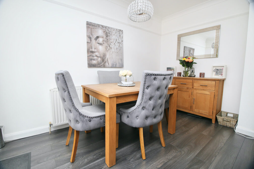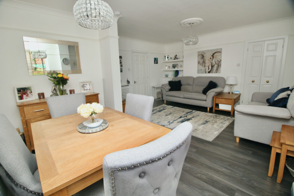 The inviting hallway provides access to all accommodations on offer and the property has been tastefully decorated throughout to offer contemporary living. As you enter the open plan lounge/dining area you will be immediately impressed by the size of room with double glazed windows which flood the room with natural light and French doors which access onto the rear garden. This area also has space for informal dining which is the perfect place for family mealtimes or entertaining. The modern kitchen has been fitted with an excellent range of base and wall units and includes gas hob, oven, washing machine, fridge freezer, dishwasher which are included in the sale. The kitchen is complete with white gloss handless doors, feature up stand and chrome accessories.