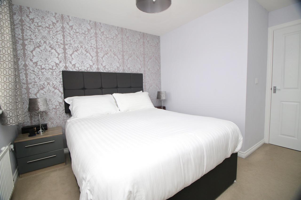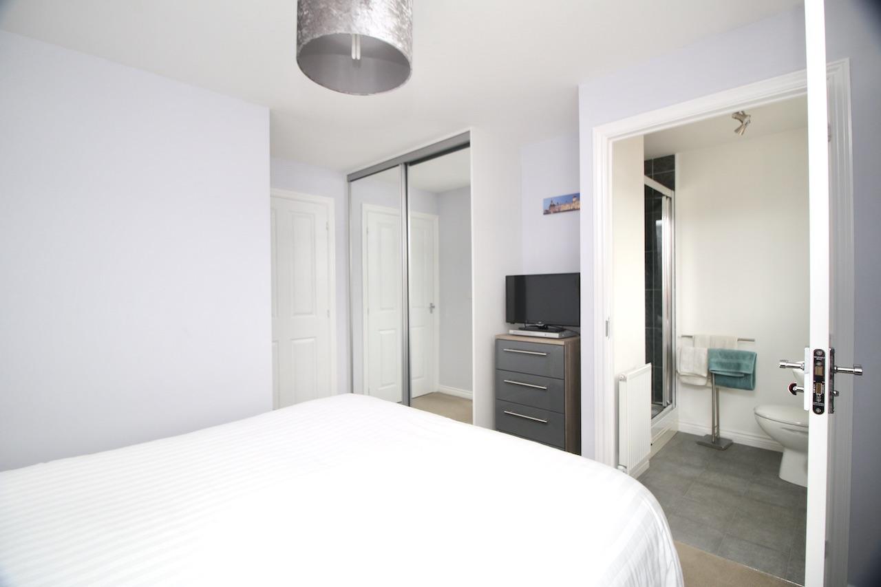 On the upper level the hallway leads to three impressive bedrooms which are of a generous size and pleasing to be in. The master bedroom has impressive dimensions complete with sliding wardrobes, along with its own ensuite facilities which includes shower cubicle with feature ceramic tiling, WC and wash basin. The beautiful family bathroom has floor to ceiling ceramic tiling with feature herringbone complete with bath, overhead rainfall shower, floating sink, WC and finished with white gloss vanity furniture and chrome towel rail.