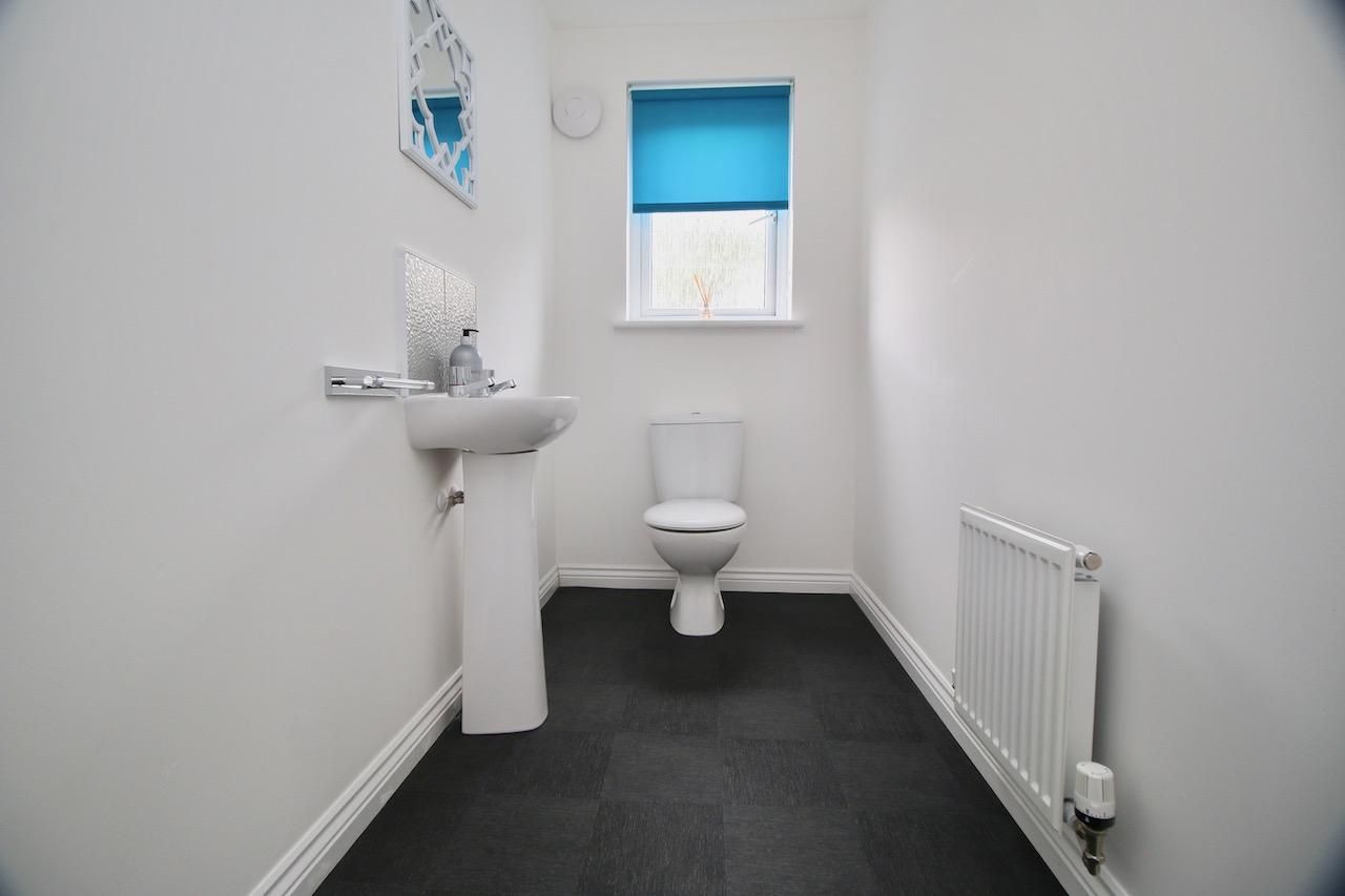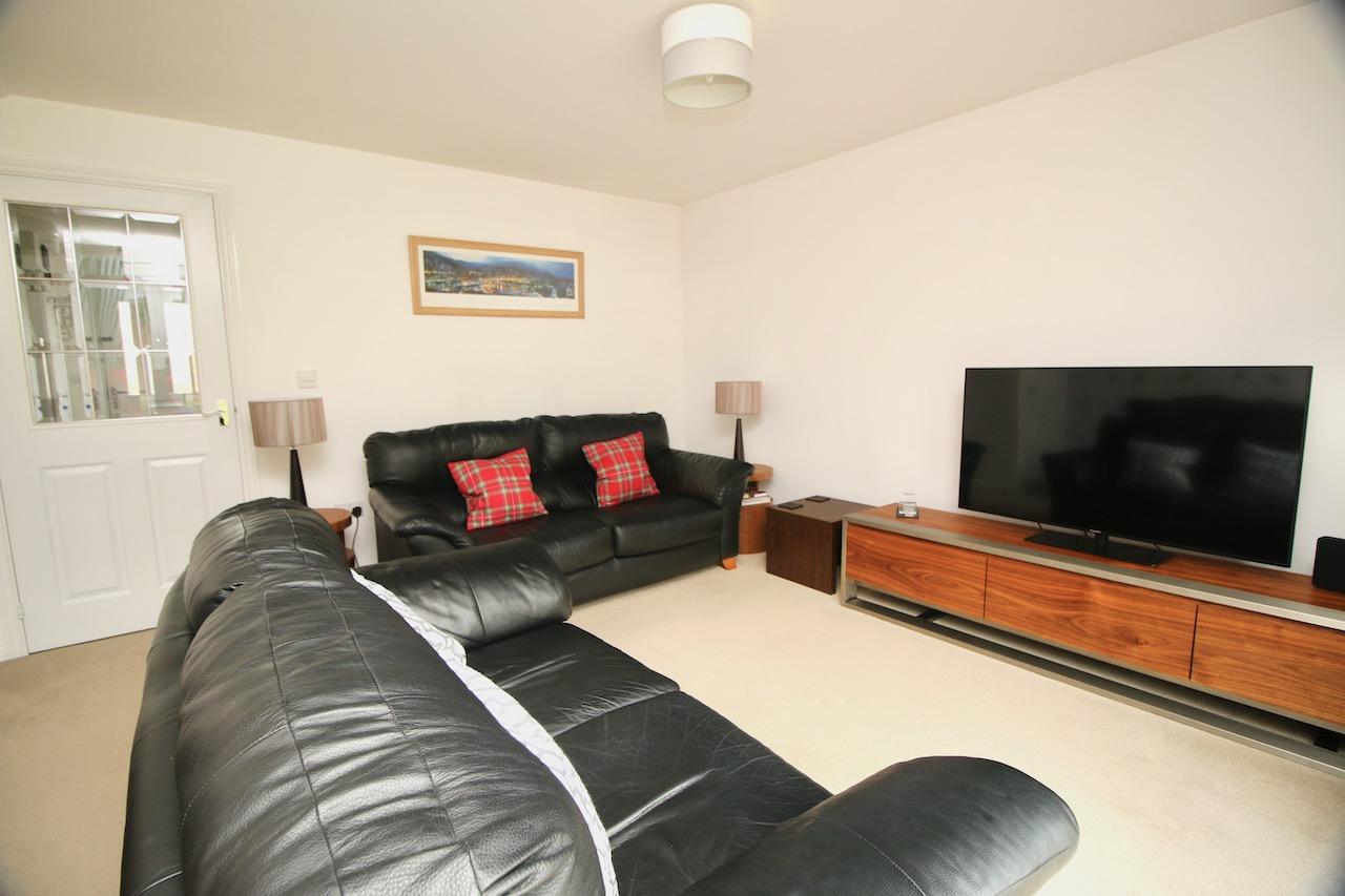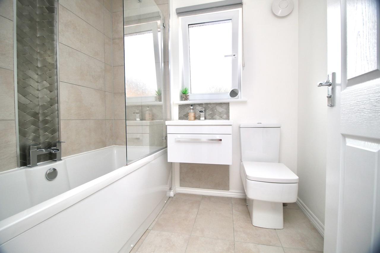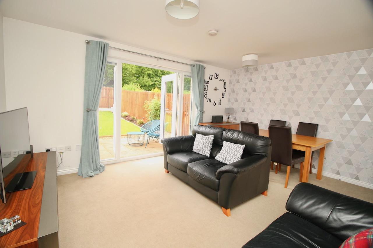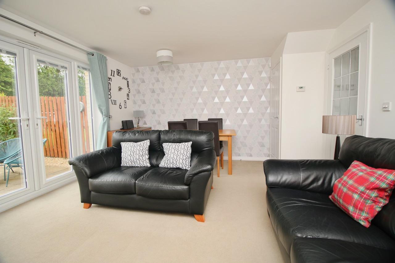 A welcome reception hallway gives access to all accommodations on the lower and upper floor. The modern kitchen enjoys an excellent range of base and wall units complete with gas hob, built in oven, integrated fridge freezer, integrated washing machine which are included in the sale finished in matt white with chrome accessories. The open plan lounge/dining is a generous size with rear facing patio doors which flood the room with natural light. The lounge has the additional space for family dining which is the perfect space for mealtimes or entertaining and looks out onto the private rear garden. To complete the ground floor is the convenient WC and plenty of storage throughout.