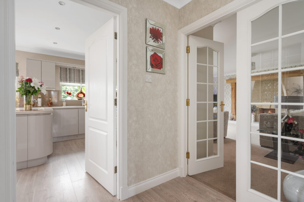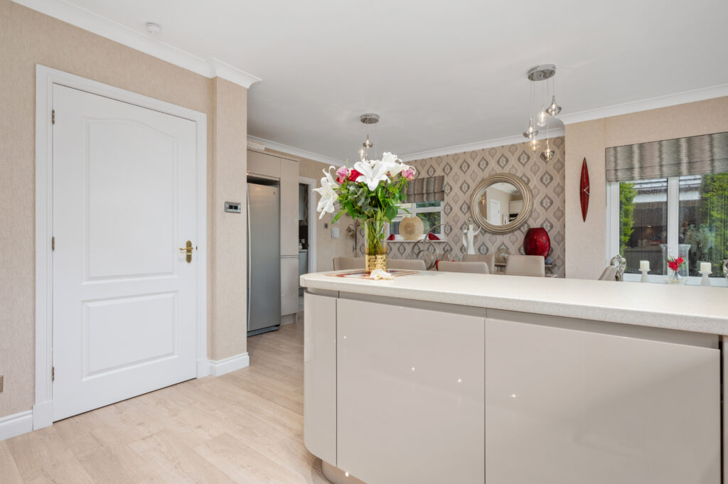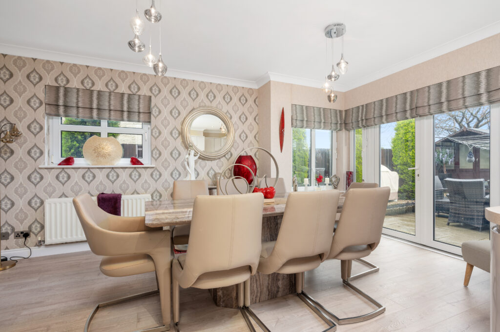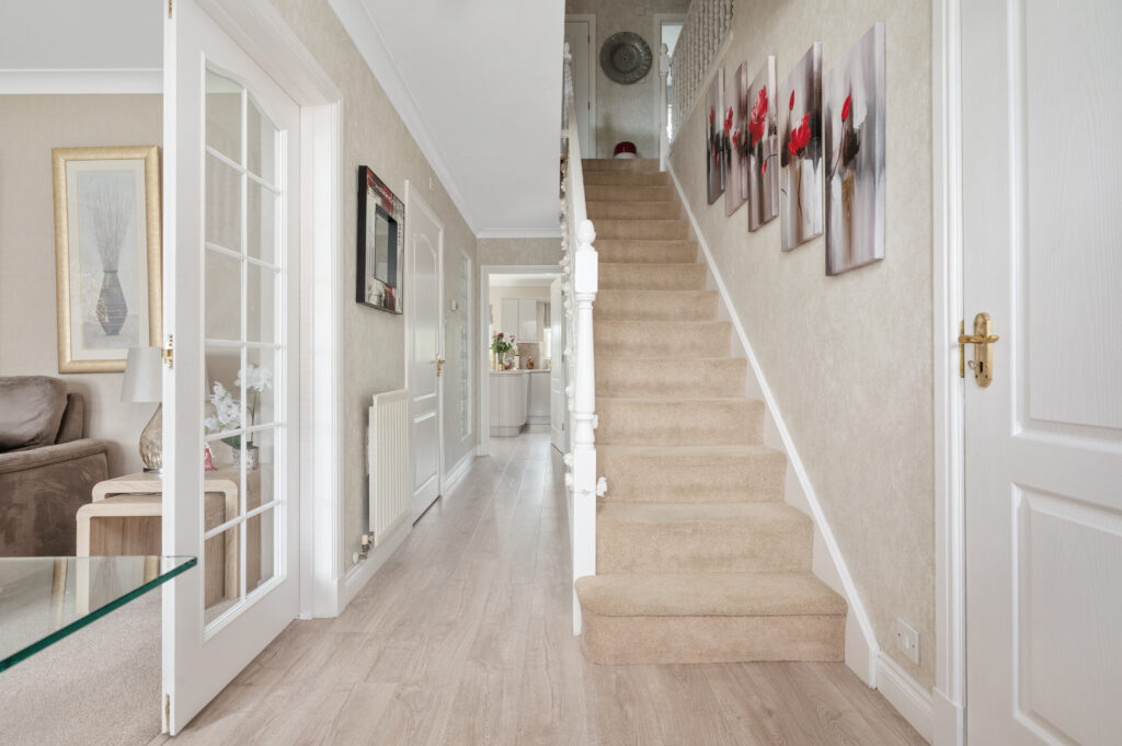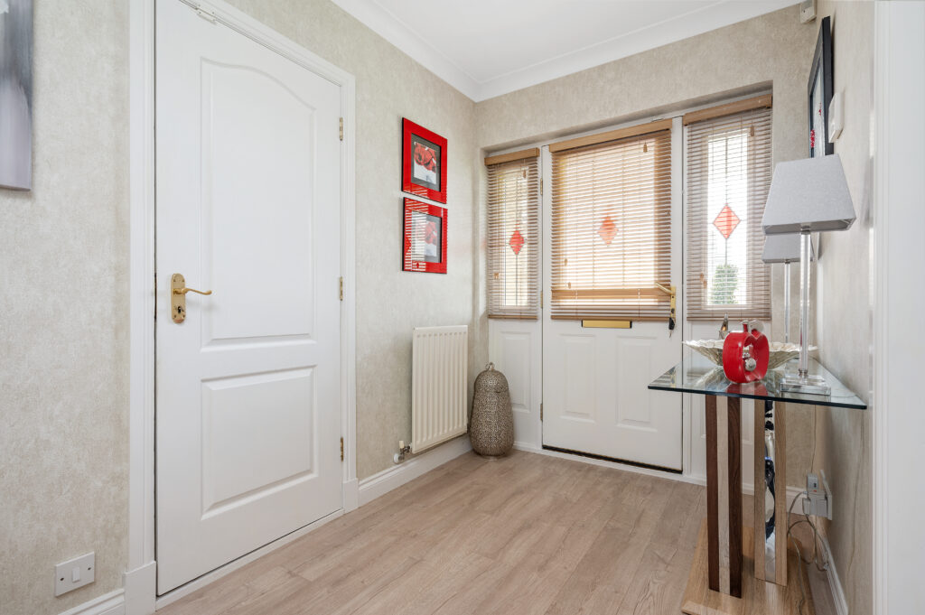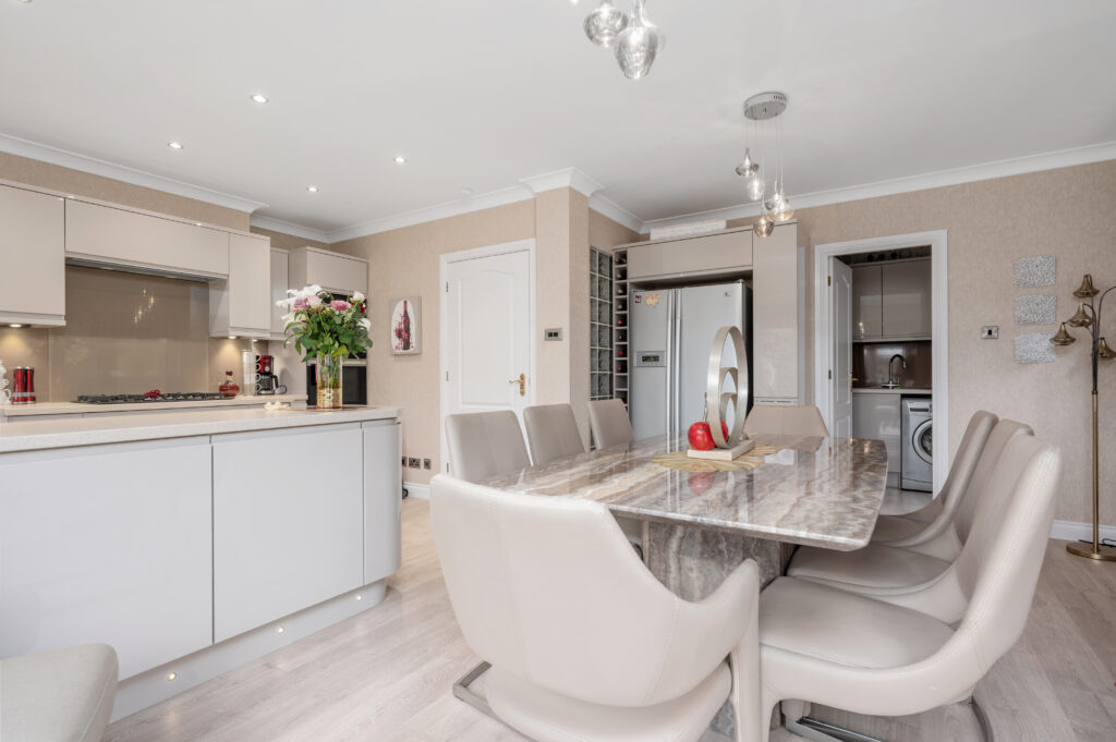 A welcome reception hallway gives access to all accommodations on the lower and upper floor. As you enter the open plan kitchen/dining area you will be immediately impressed by the generous size of the room, with French doors which lead out to the private patio area. The recent remodelled kitchen which is a high specification includes; hob, double oven, integrated dishwasher, fridge freezer, washing machine which are all included in the sale. The kitchen is finished with handless latte gloss doors, feature glass splash back, under counter lighting and chrome accessories. The dining area is the perfect place for family mealtimes or entertaining and looks out onto the rear garden. The utility room is the ideal place for keeping laundry out of sight complete with base and wall units, sink and handy side door access to the rear garden or driveway. The family room is perfect for children's TV/play area or professional office perfect for home working professionals. The formal lounge is sure to impress by the sheer dimensions with French door access out into the garden complete with feature fireplace which is the focal point of the room. To complete the ground floor is the contemporary WC finished with mosaic tiling, glass wash basin, WC and chrome accessories. Convenient garage access can be located in the downstair hallway.