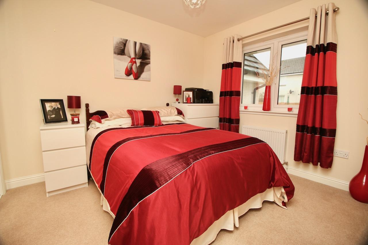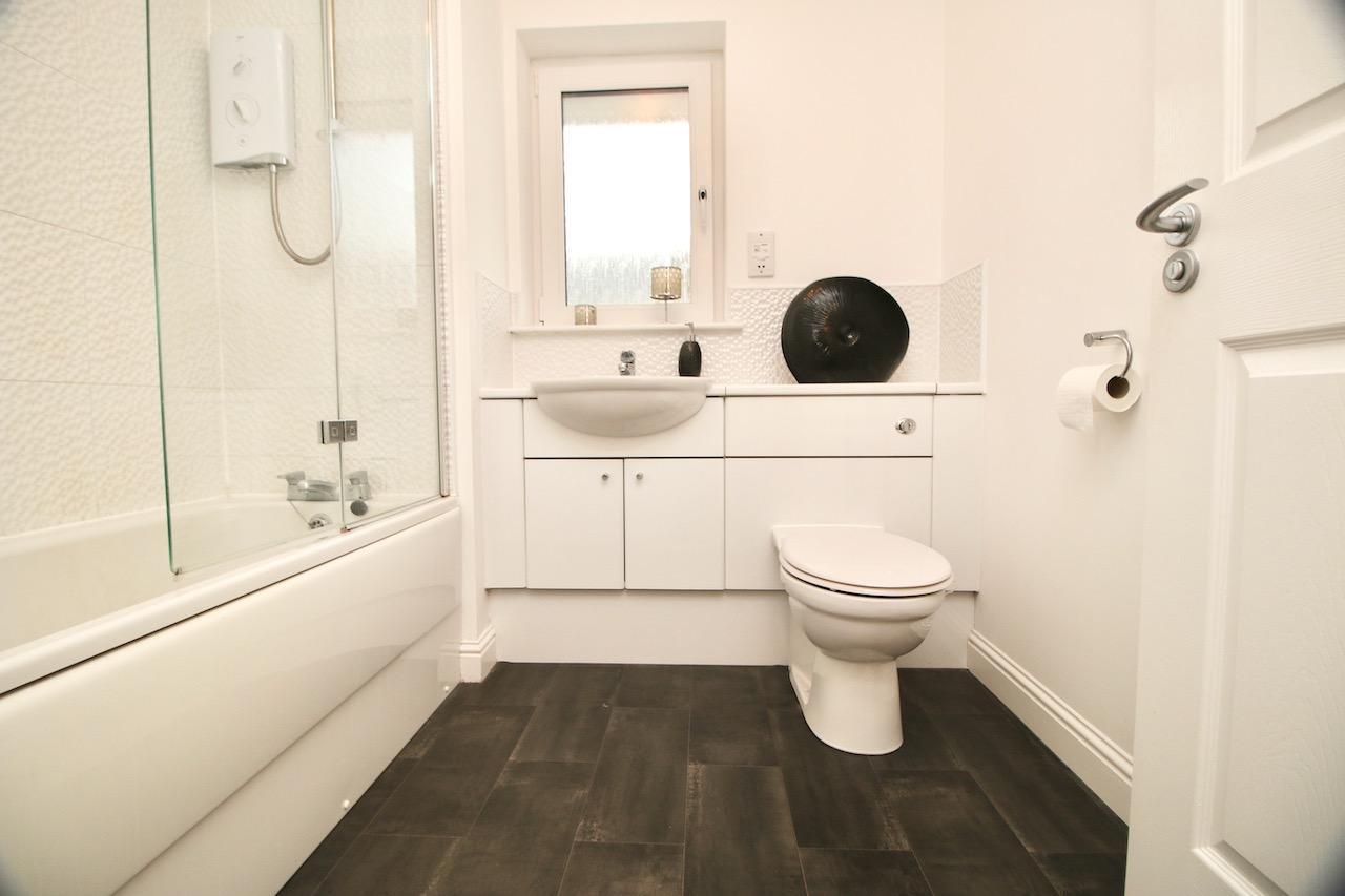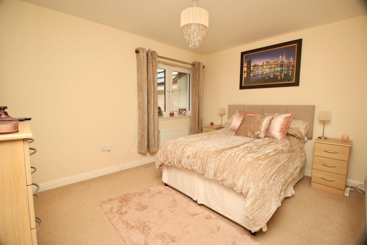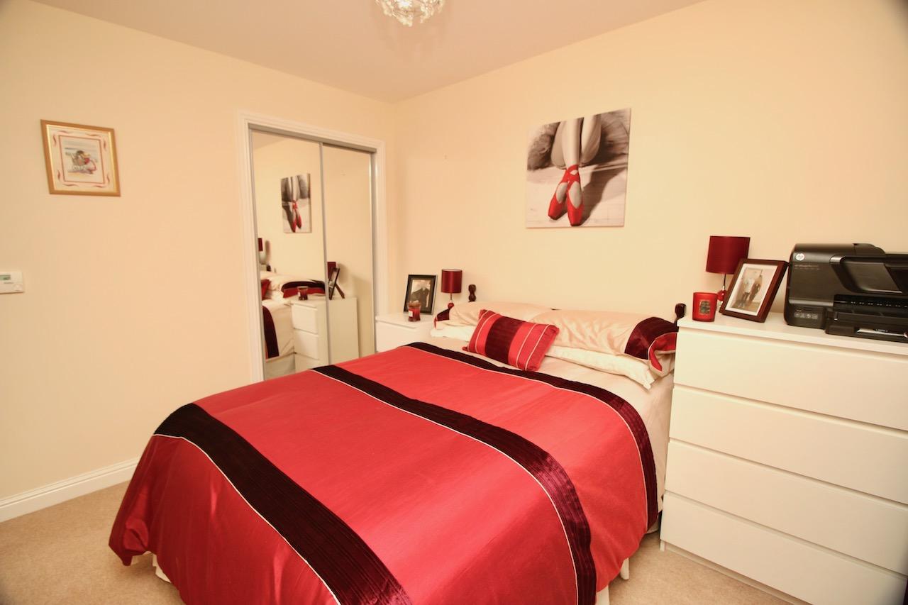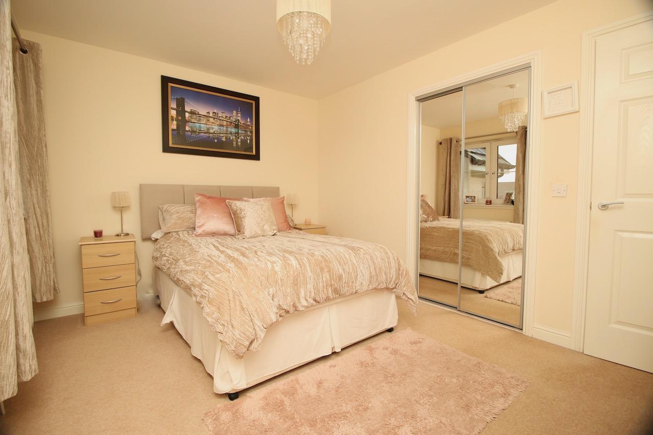 On the upper level, the hallway leads to the impressive two double bedrooms which are pleasing to be in and offer good size accommodation, both with their own mirrored wardrobes. The master bedroom also has the added benefit of its own walk in wardrobe. The family bathroom includes: bath, overhead electric shower, wash basin, WC complete with white gloss vanity furniture and chrome accessories.