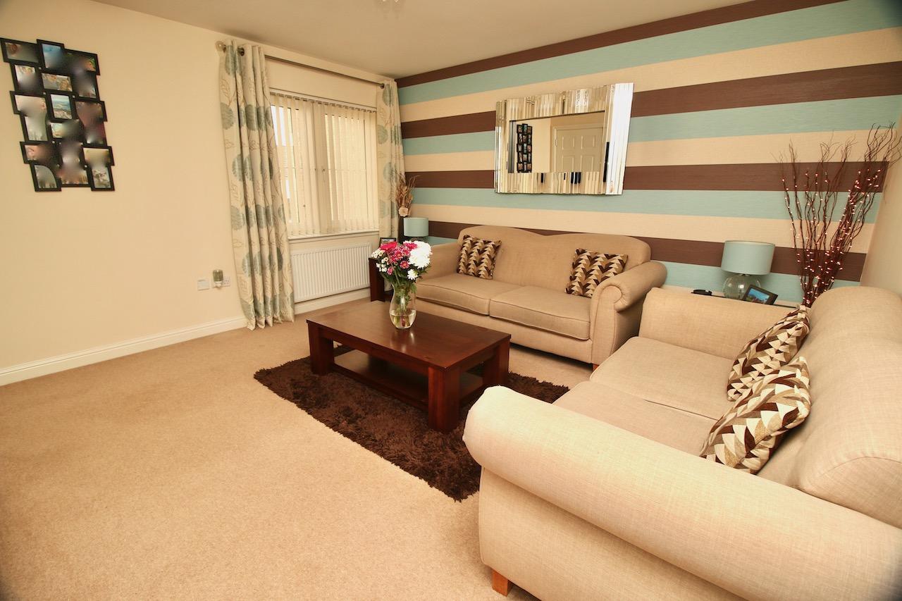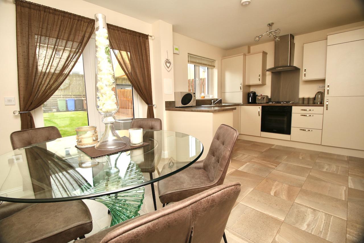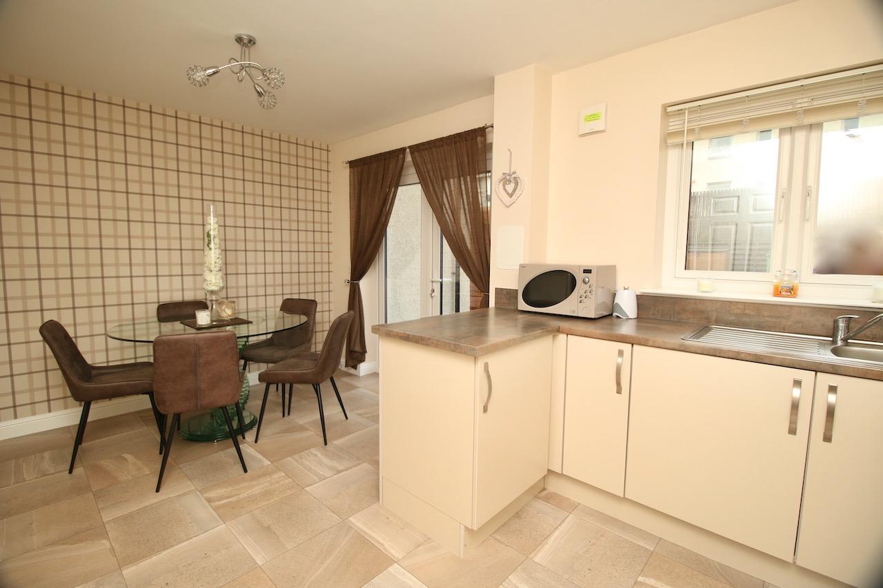 As you enter the property you are welcomed by the reception hallway which leads to all accommodations on the lower and upper floor. The bright front facing lounge is sure to impress by the generous proportion of the room with large double glazed windows which flood the room with natural light. The contemporary open plan kitchen enjoys an excellent range of base and wall units complete with gas hob, oven, integrated appliances include washer/dryer, fridge freezer which are all included in the sale, finished with matt latte doors, chrome accessories and ceramic floor tiling. There is additional space for informal dining which is the perfect area for family mealtimes or entertaining with patio doors which open onto the sizeable rear garden. To complete the ground floor is the convenient WC and plenty of storage.