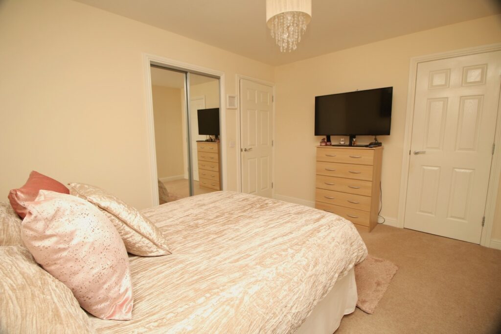 On the upper level, the hallway leads to the impressive two double bedrooms which are pleasing to be in and offer good size accommodation, both with their own mirrored wardrobes. The master bedroom also has the added benefit of its own walk in wardrobe. The family bathroom includes: bath, overhead electric shower, wash basin, WC complete with white gloss vanity furniture and chrome accessories.