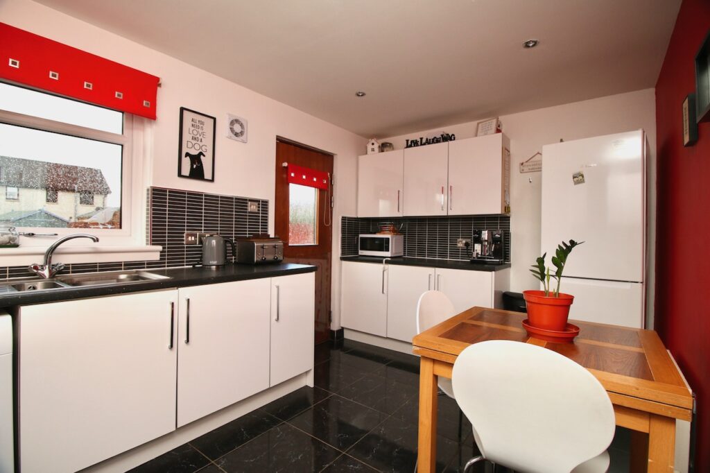 As you enter the property you are welcomed by a practical entrance vestibule leading into the lounge area. The lounge is of a generous size with front facing double glazed windows which flood the room with natural light with feature fireplace. The spacious kitchen/dining area enjoys an excellent range of base and wall units complete in white gloss design. The dining area is the perfect space for family mealtimes or entertaining and benefits from rear door access into the rear garden.