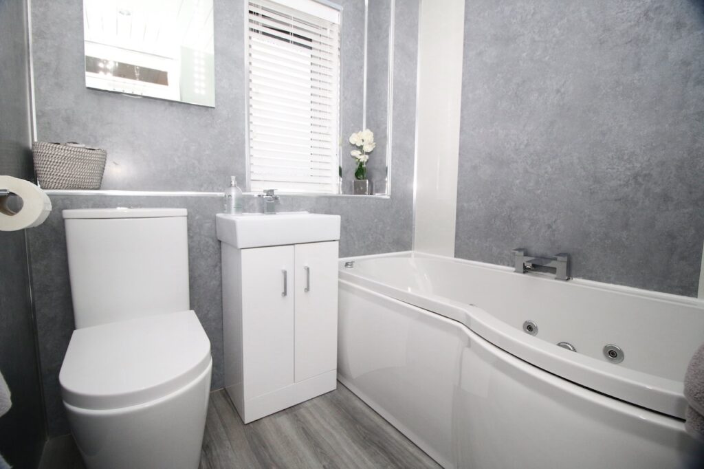 On the upper level, there are 2 bedrooms which are beautifully presented and the family bathroom which has been upgraded to include a p-shaped jacuzzi bath, chrome towel heater, vanity sink with storage finished with contemporary grey and white colours.