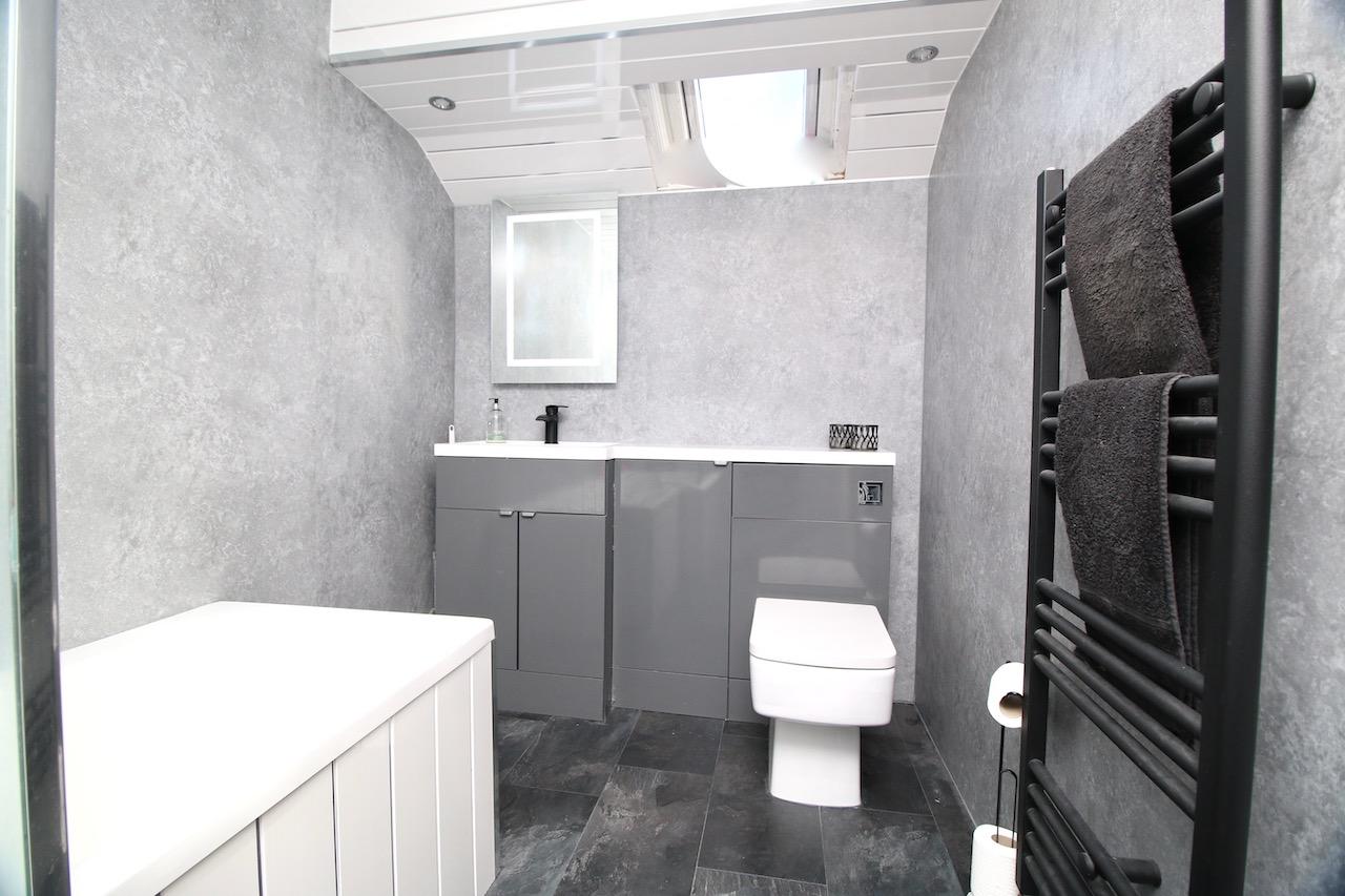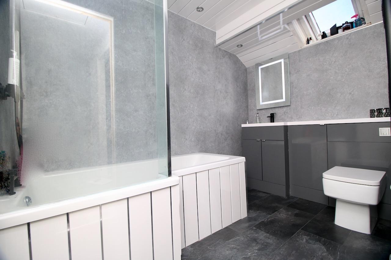 On the upper level, the light and airy hallway leads to impressive two double bedrooms which are pleasing to be in and offer good size accommodation with the added benefit of excellent storage. The newly fitted family bathroom includes, L-shaped bath, overhead waterfall shower, wash basin, WC, finished with high gloss grey vanity furniture and black matt accessories.