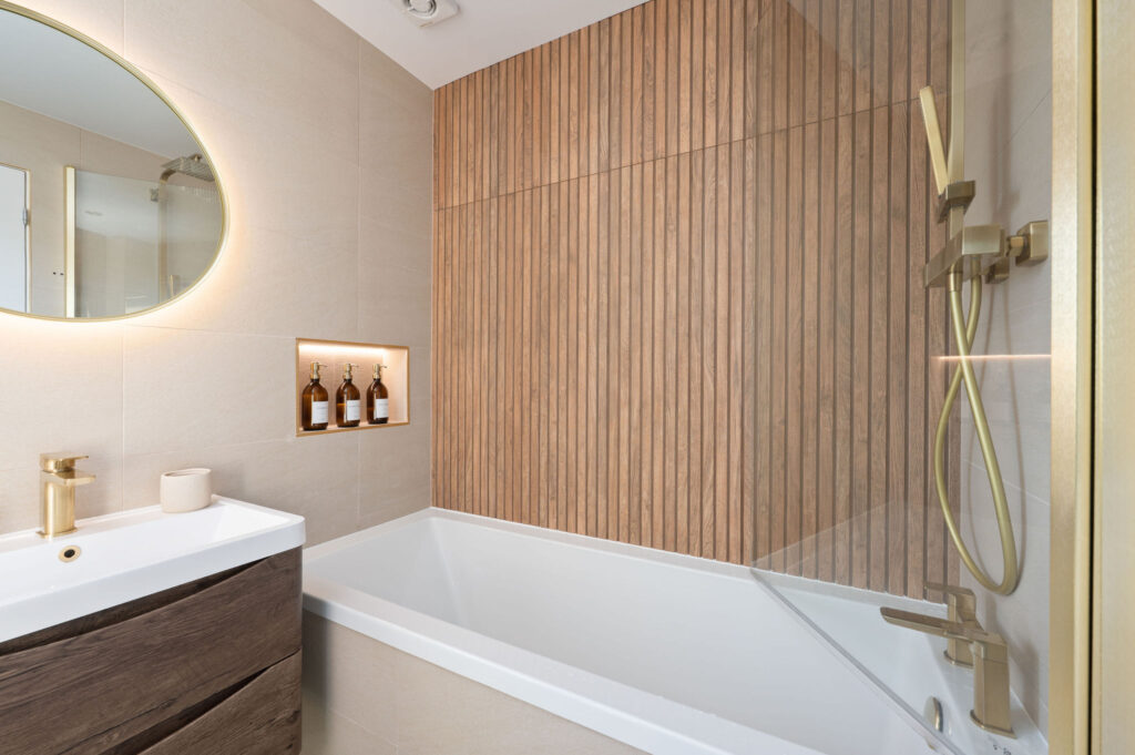 On the upper level are four well proportioned double bedrooms which are all decorated to a high standard with the master bedroom having it’s own ensuite facilities. The master bedroom has the real wow factor; impressive dimensions complete with feature wood panelling and its own ensuite facilities which includes walk in double shower cubicle, WC, wash basin and finished with wall tiling and chrome accessories. The beautiful family bathroom which has been recently re-modelled, complete with bath, wash basin, WC, overhead rainfall shower finished with walnut vanity furniture, feature wood panel and gold accessories.
