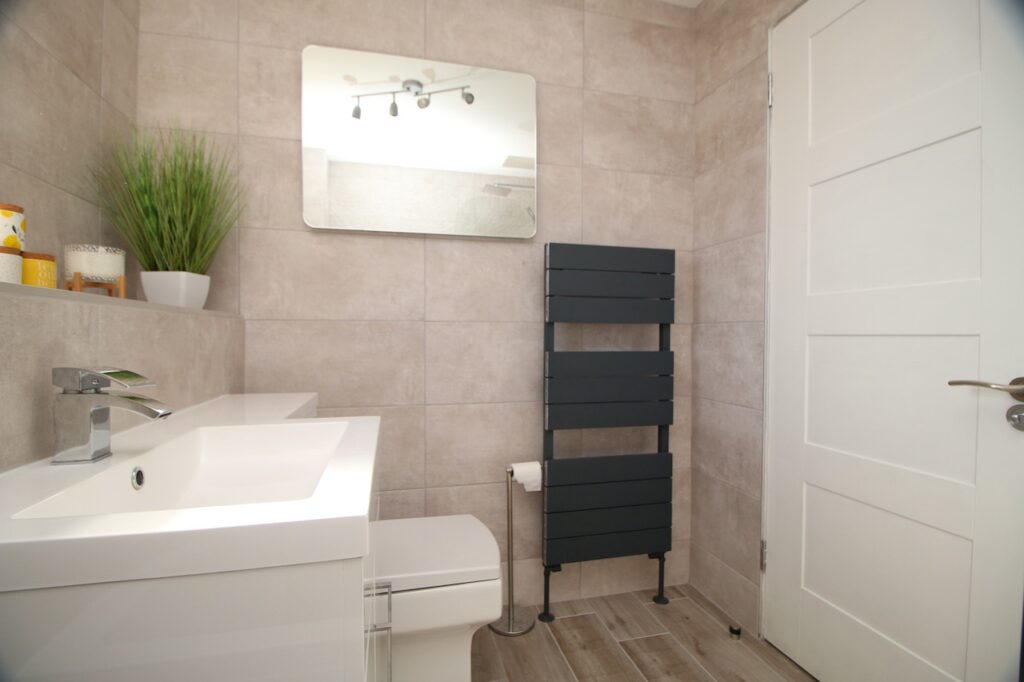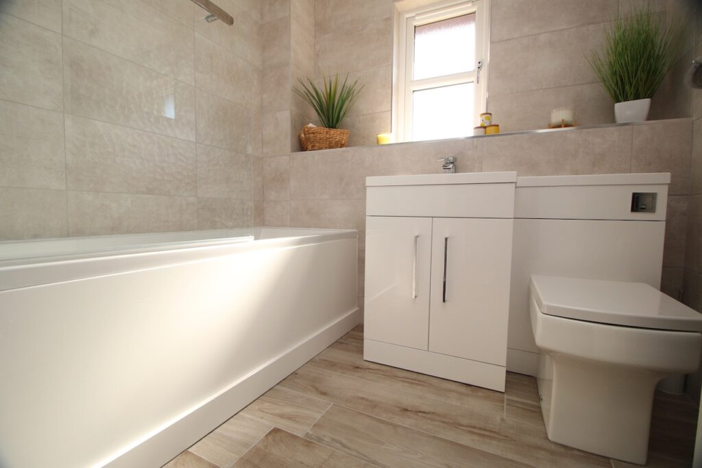 On the upper level the light and airy hallway leads to three well proportioned double bedrooms (one which includes wardrobe storage), family bathroom and office area. The impressive master bedroom is generous in size and enjoys its own en-suite facilities which includes bath, overhead shower, half height wall tiling and matching floor tiles. The family bathroom has been recently upgraded and provides full height Porcelanosa wall tiling with matching floor tiles, overhead waterfall shower, white bath and white gloss vanity furniture.