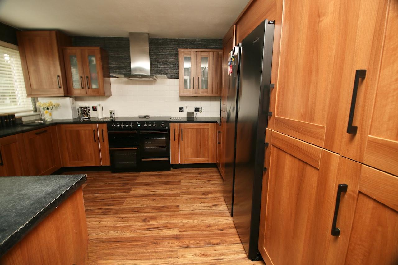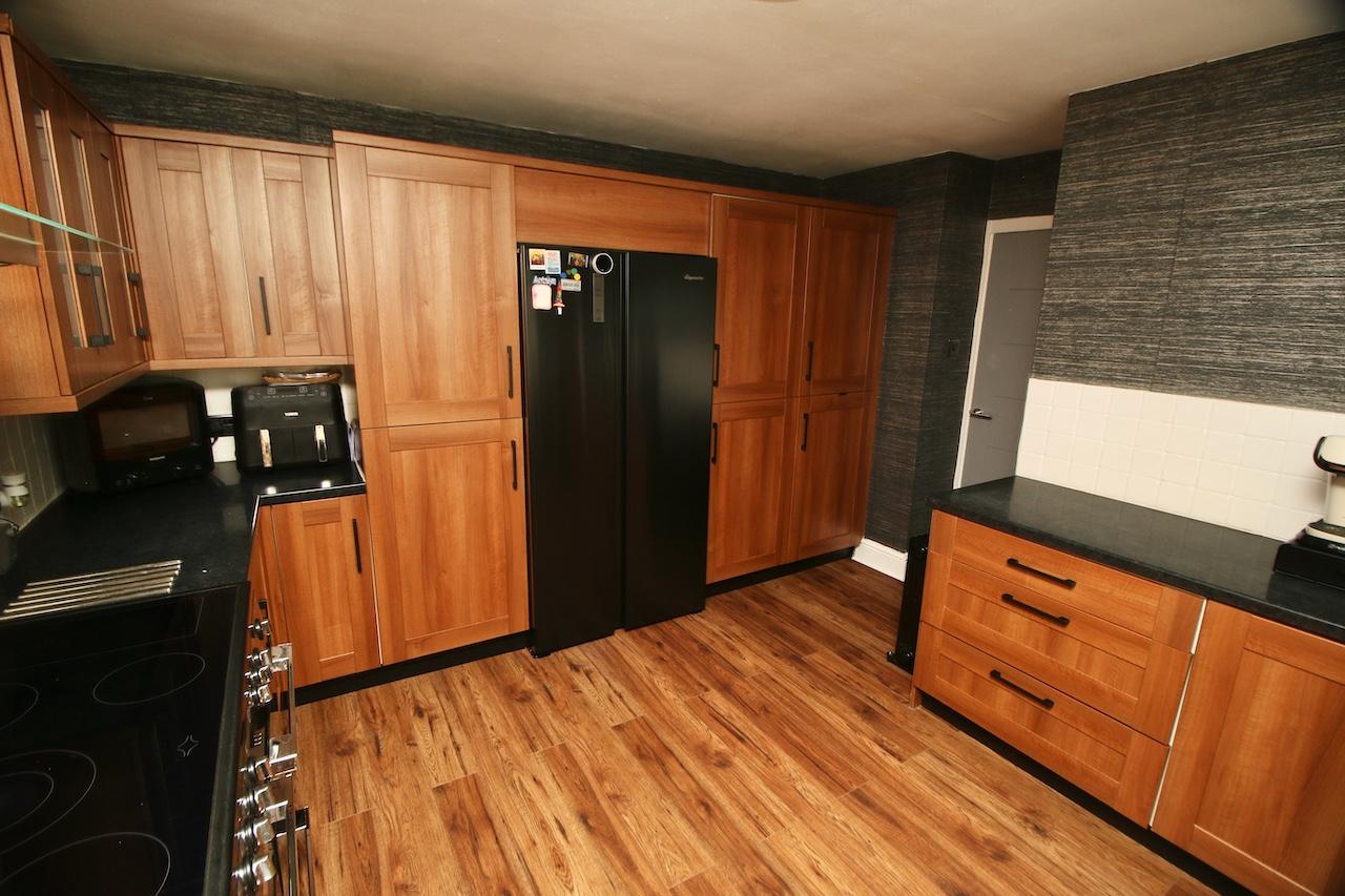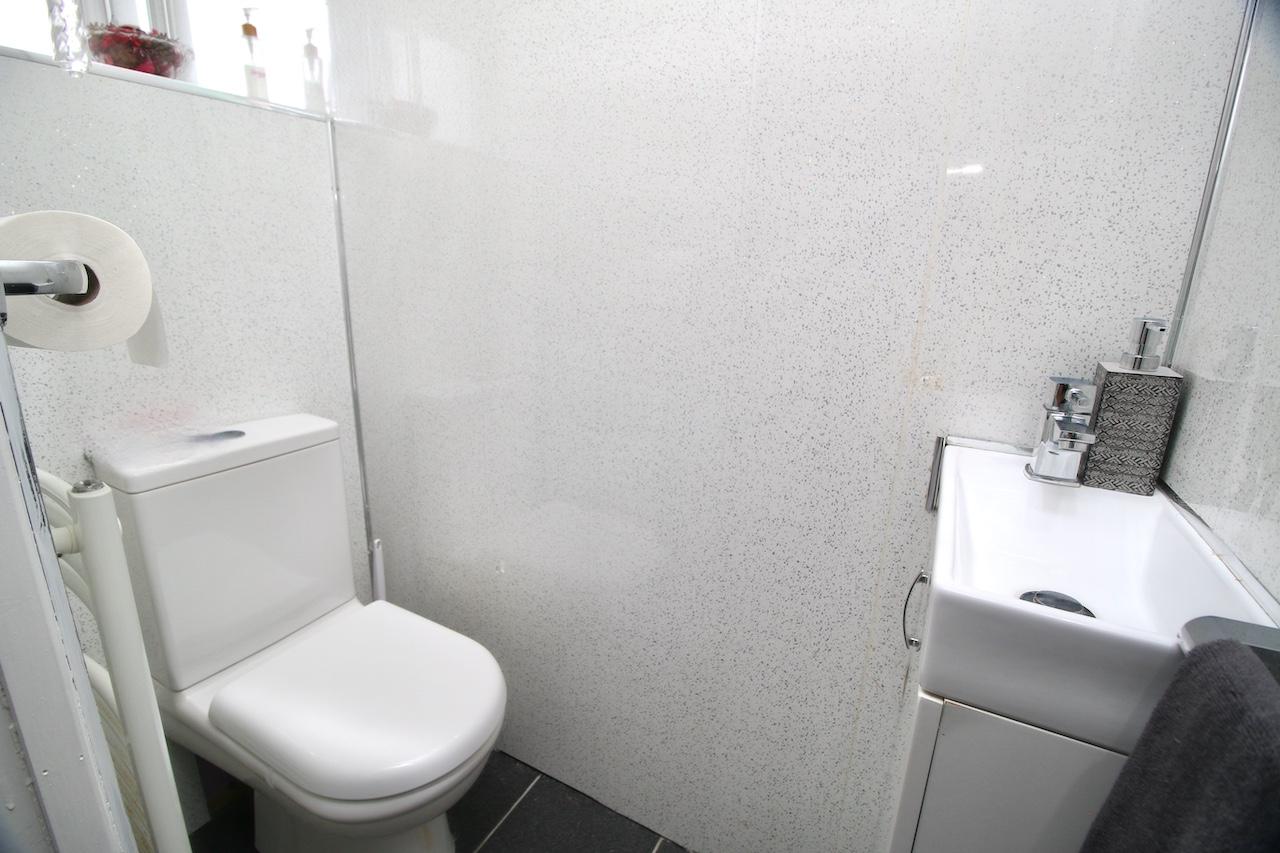 A welcome reception hallway gives access to all accommodations on the lower and upper floor. The bright rear facing lounge is sure to impress by the generous proportion of the room, with brand new double glazed windows which flood the room with natural light and look out onto the rear garden. The focal point of the room is the gas fireplace and beautiful surround perfect for cosy nights in. To complete the lounge area is handy rear door access to the garden and large store cupboards. The modern kitchen has been fitted with an excellent range of base and wall units complete with range cooker, fridge/freezer, integrated appliances include dishwasher and washing machine which are all included in the sale. The kitchen is finished with shaker doors, black worktop and feature flooring. To complete the ground floor is a convenient WC complete with wash basin and white gold vanity furniture.