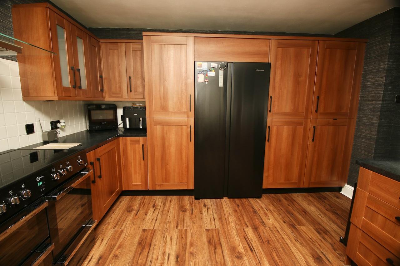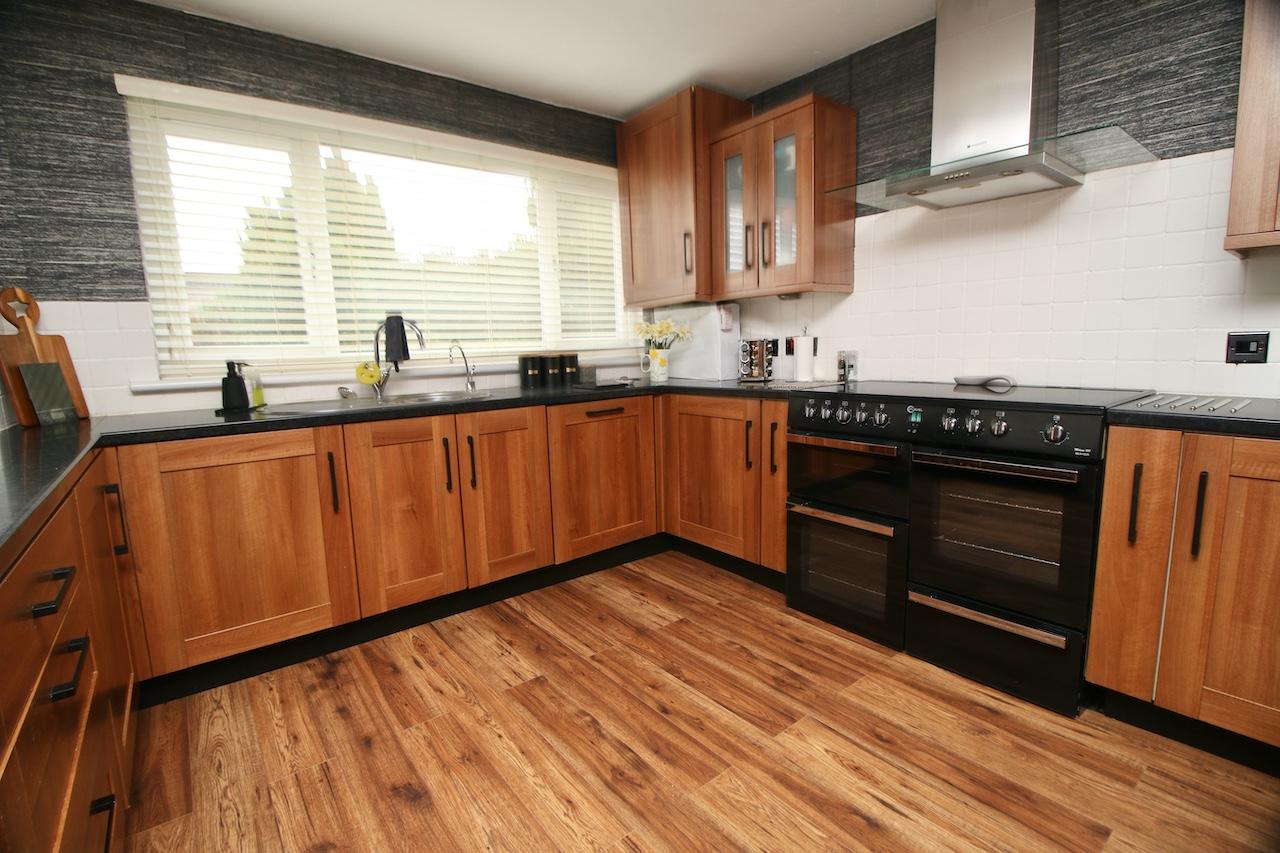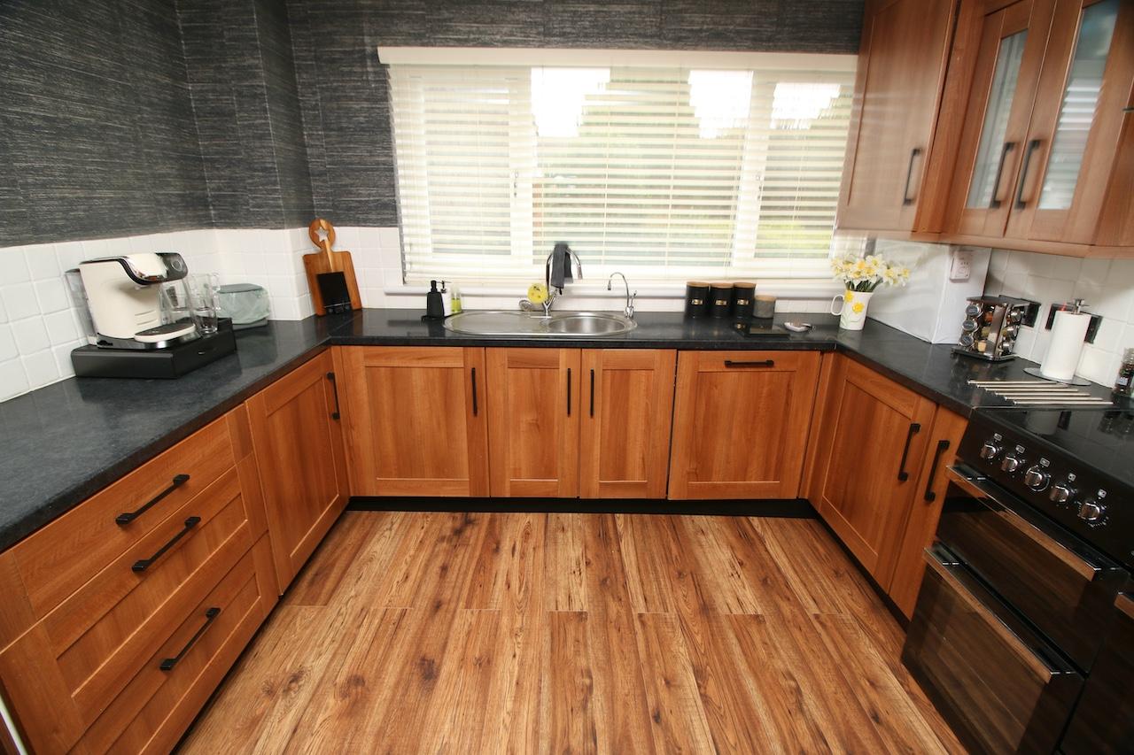 A welcome reception hallway gives access to all accommodations on the lower and upper floor. The bright rear facing lounge is sure to impress by the generous proportion of the room, with brand new double glazed windows which flood the room with natural light and look out onto the rear garden. The focal point of the room is the gas fireplace and beautiful surround perfect for cosy nights in. To complete the lounge area is handy rear door access to the garden and large store cupboards. The modern kitchen has been fitted with an excellent range of base and wall units complete with range cooker, fridge/freezer, integrated appliances include dishwasher and washing machine which are all included in the sale. The kitchen is finished with shaker doors, black worktop and feature flooring. To complete the ground floor is a convenient WC complete with wash basin and white gold vanity furniture.
