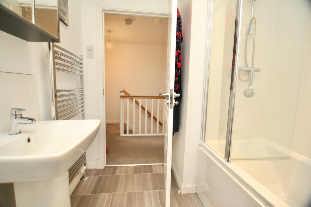 On the upper level the hallway leads to three impressive bedrooms which are of a generous size and pleasing to be in with the master bedroom having its own wardrobe storage. The family bathroom is complete with WC, wash basin, bath, overhead shower with chrome heated towel rail.