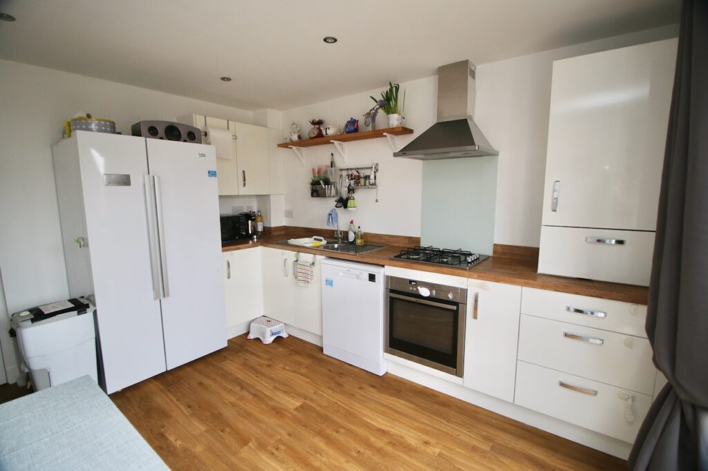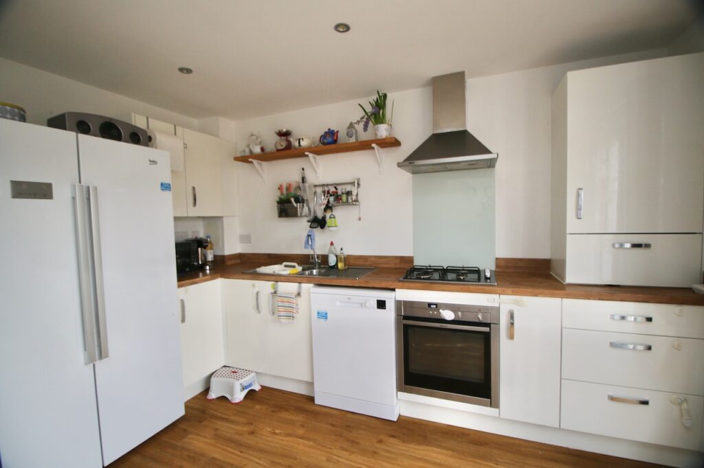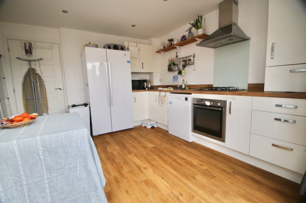 A welcome reception hallway gives access to all accommodations on the lower and upper floor. The lounge is of a generous size with front facing double glazed windows which flood the room with natural light. The lounge is complete with a large storage cupboard. The modern kitchen enjoys a good range of base and wall units complete with gas hob, built in oven, fridge freezer, washing machine, washer dryer which may be included in the sale. The kitchen is finished with feature glass splash back, oak block worktop, gloss white doors with chrome accessories. The kitchen has the additional space for informal dining which is the perfect place for family mealtimes or entertaining with large French doors which access the rear garden.