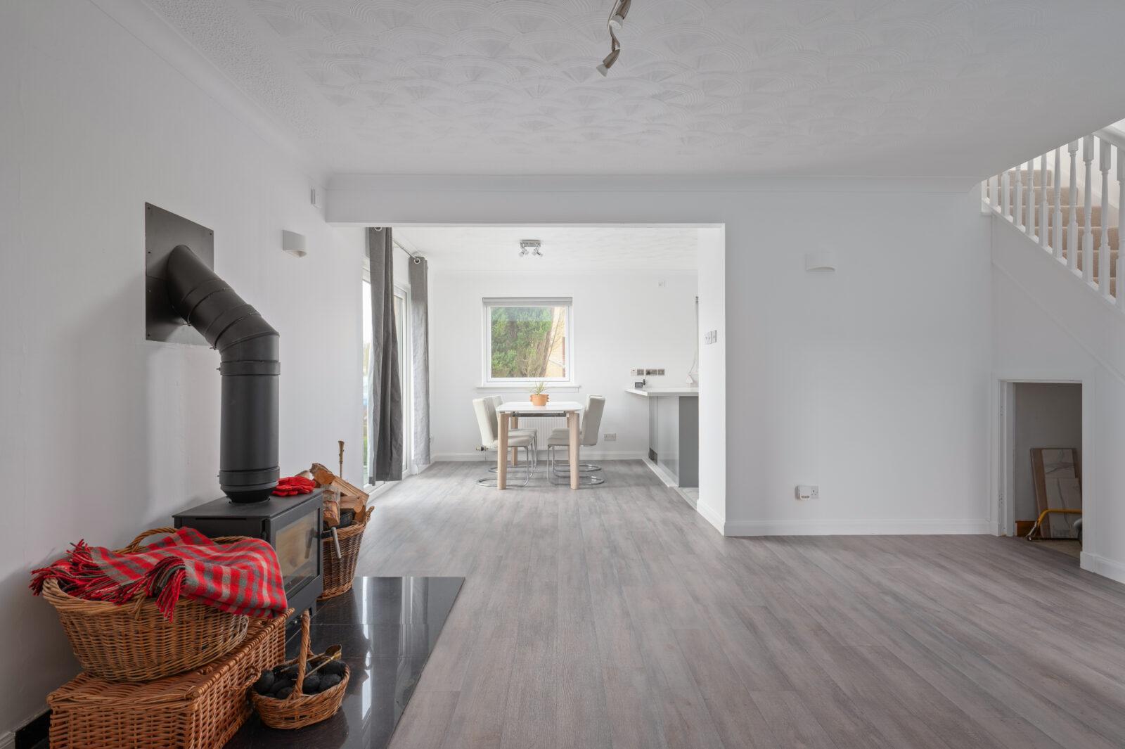 The welcoming entrance hallway includes a convenient WC, leading to a stunning open-plan lounge, dining, and kitchen area. This space features a newly installed wood burner for a cosy ambiance and a well-appointed kitchen with an excellent range of base and wall units, a breakfast bar, and French doors opening to the garden from the dining area —perfect for indoor-outdoor living.