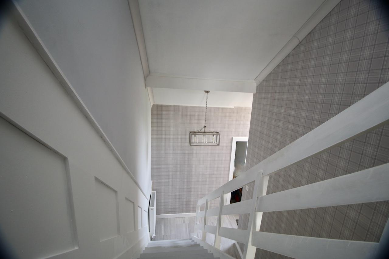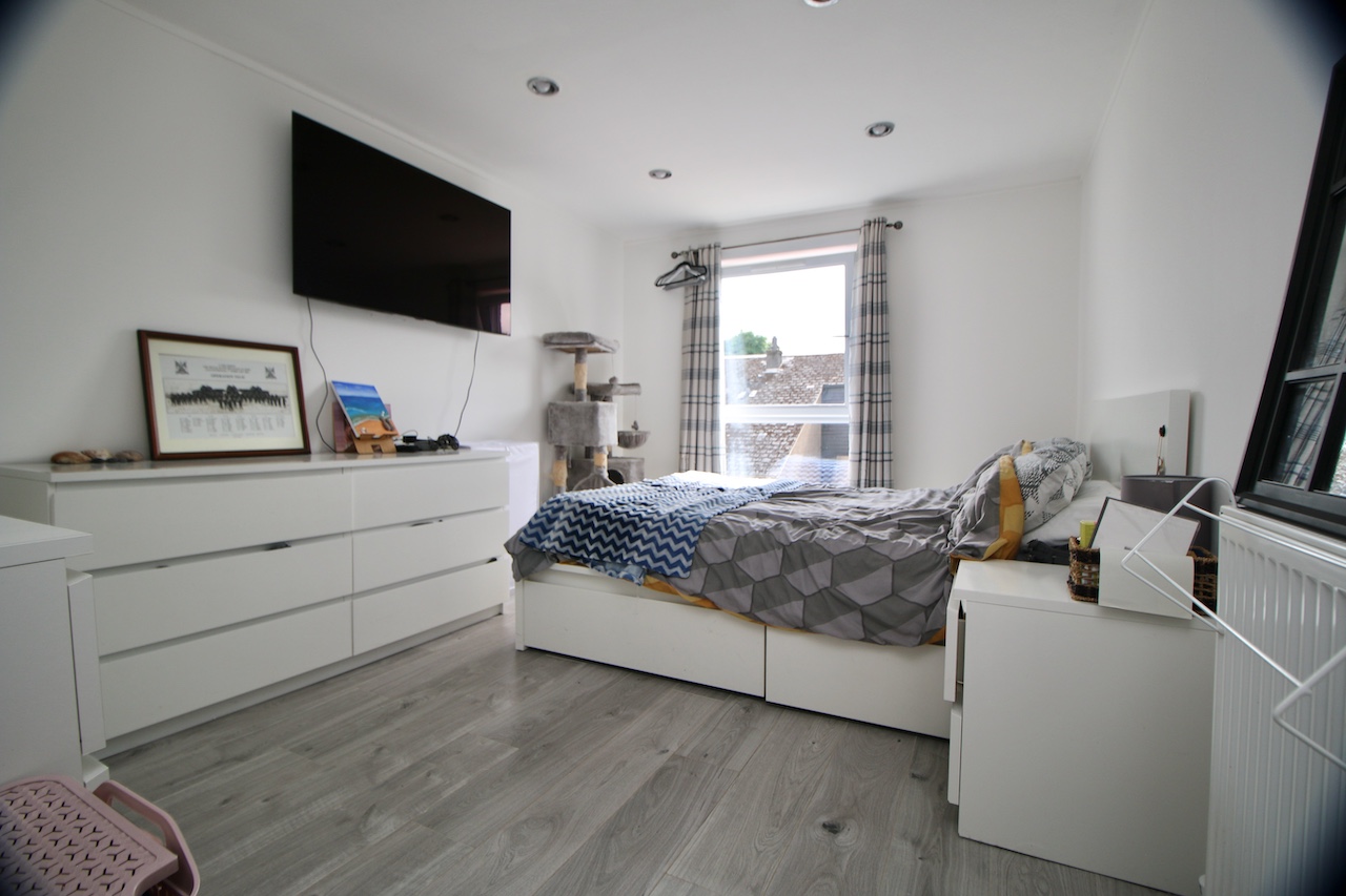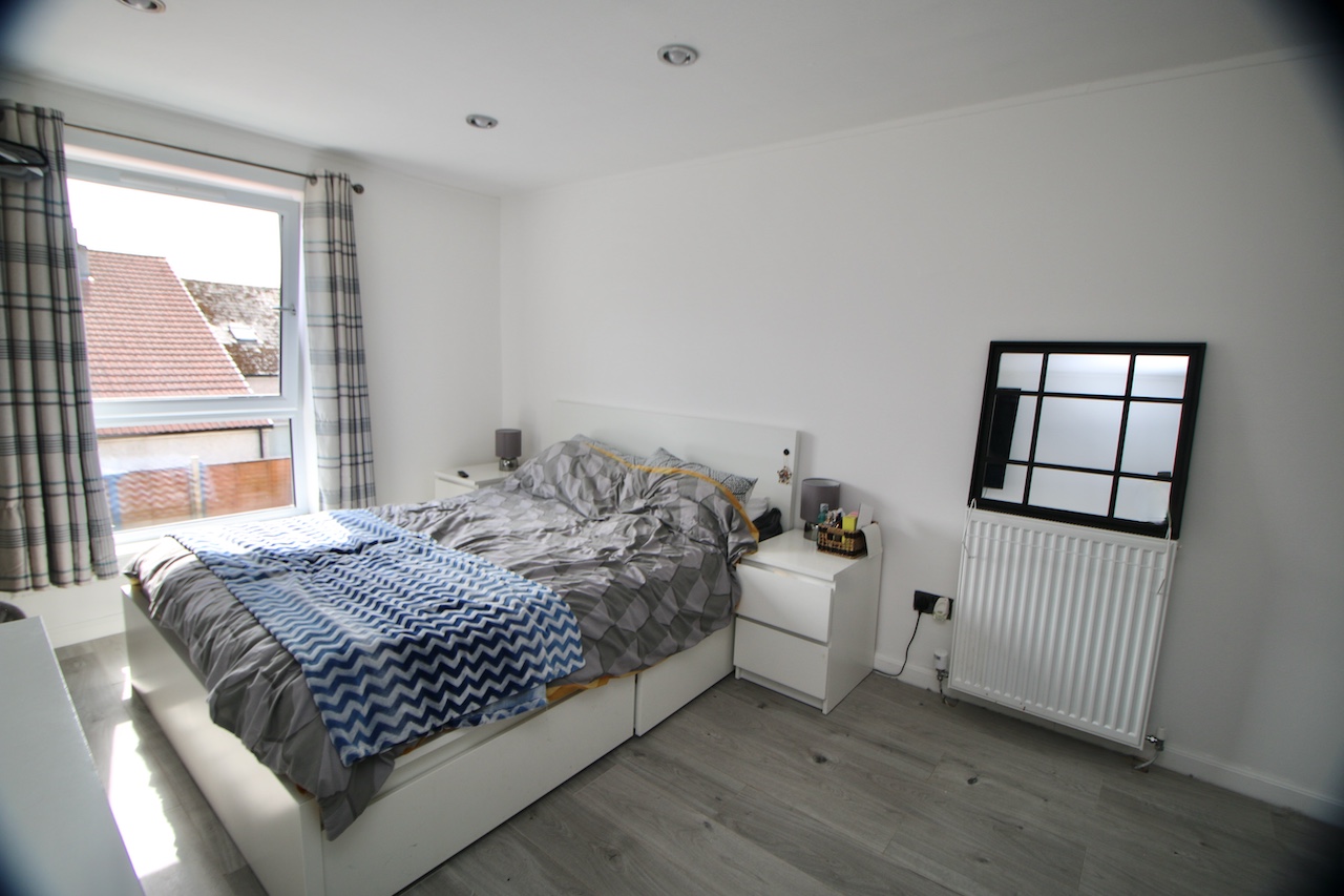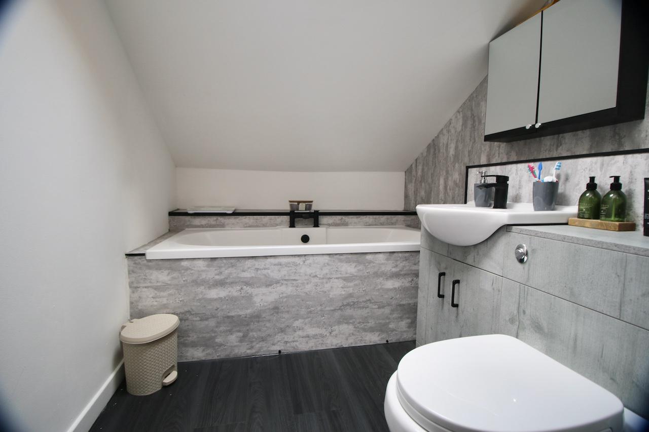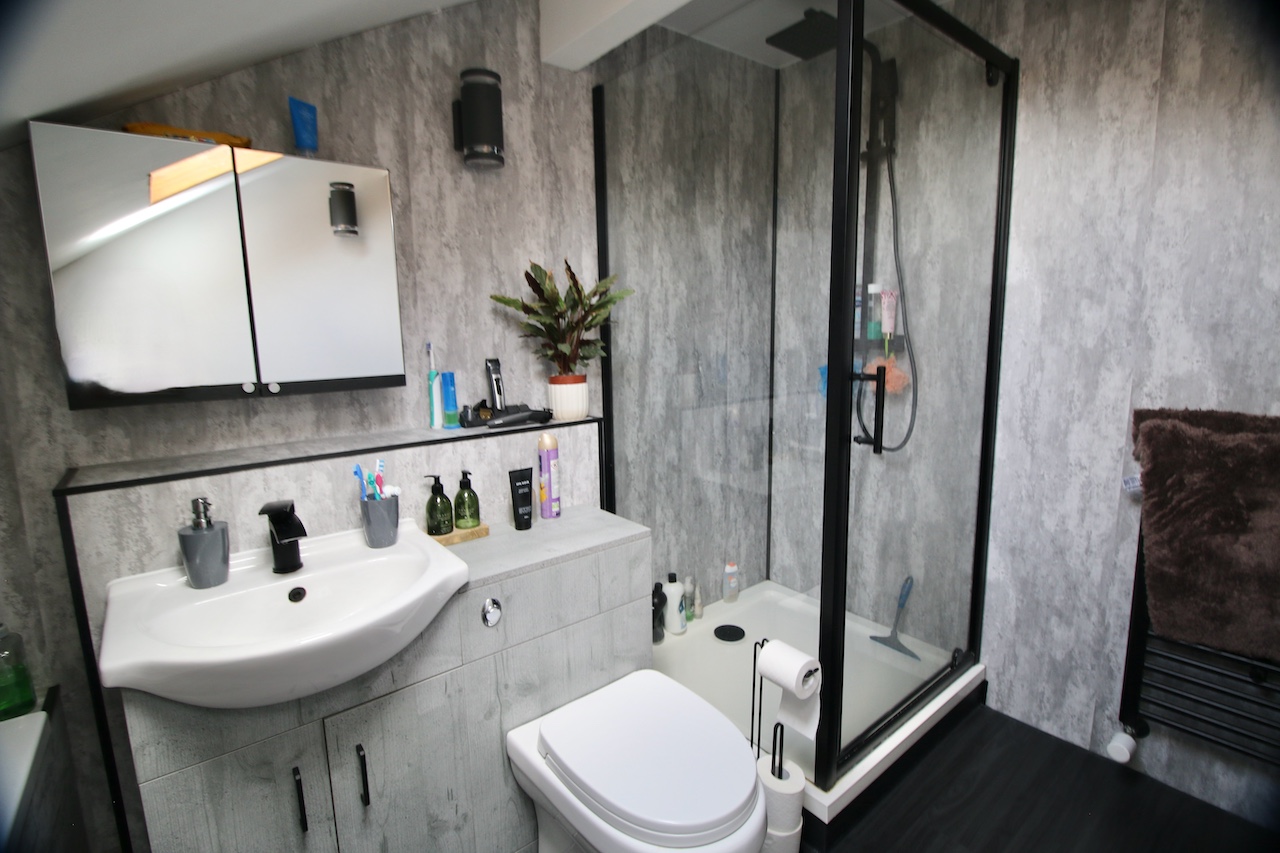 On the upper level, the light and airy hallway leads to impressive two double bedrooms which are pleasing to be in and offer good size accommodation. The newly fitted family bathroom includes; bath, separate shower cubicle, WC, wash basin and skylight double glazed window. The bathroom is finished with modern wet wall, vanity furniture and black accessories. To complete the upper floor is excellent storage.
