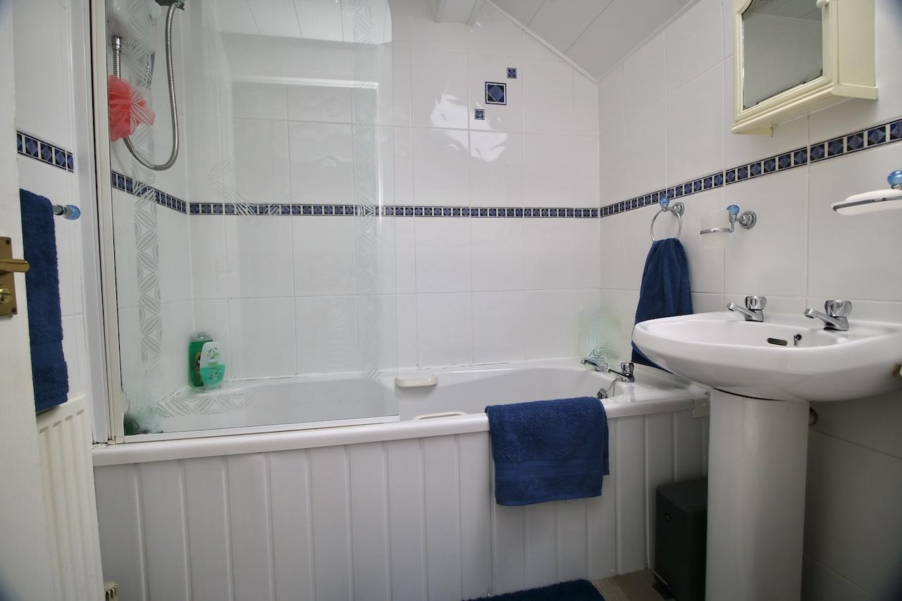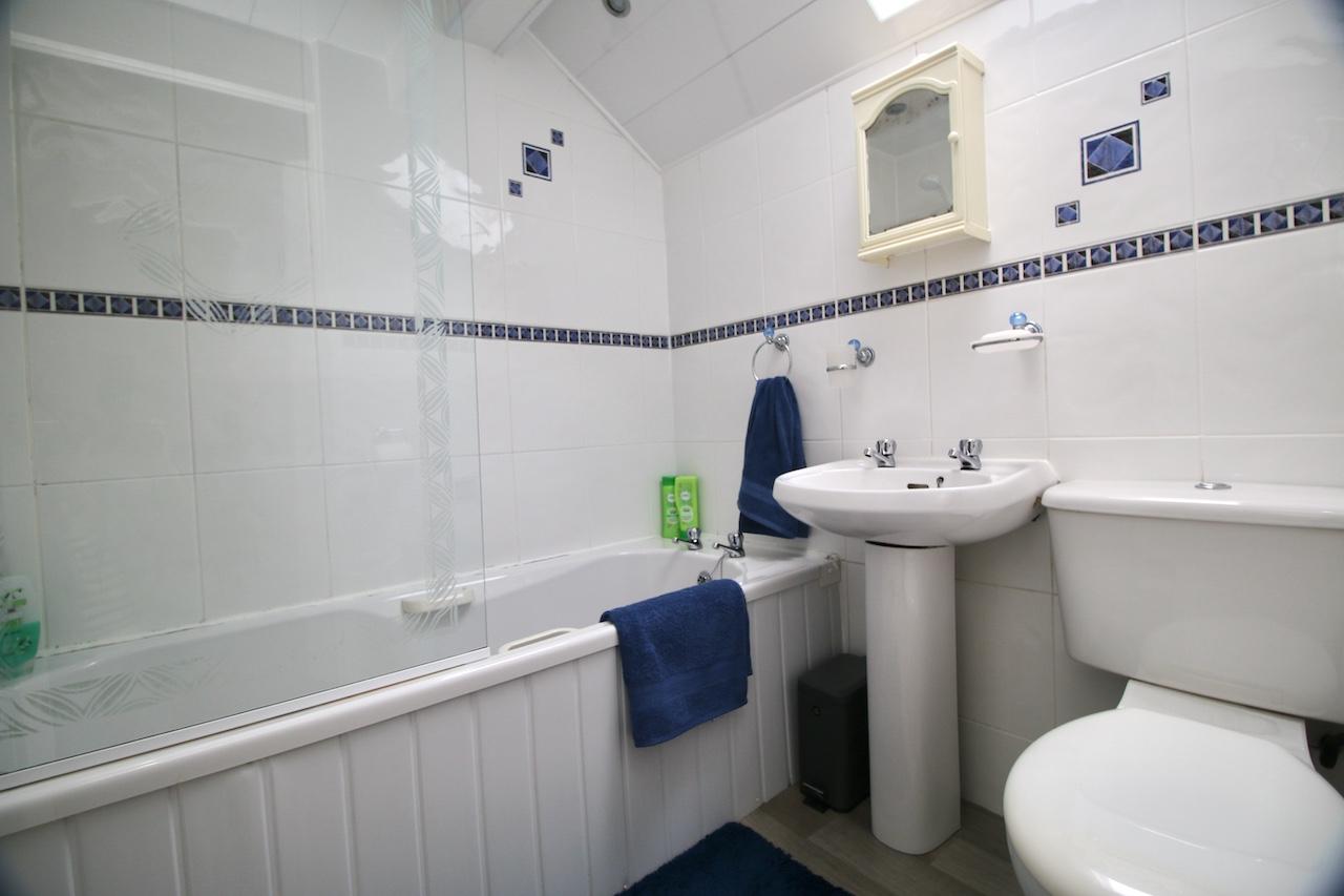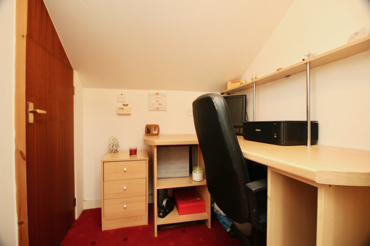 On the upper level, the light and airy hallway leads to impressive two double bedrooms which are pleasing to be in and offer good size accommodation, with the added benefit of excellent storage. The family bathroom includes; bath, overhead shower, WC, wash basin with full height wall tiling, chrome accessories and skylight double glazed window. To complete the upper floor is a large store room which has been utilised as a home office, perfect for home working professionals.