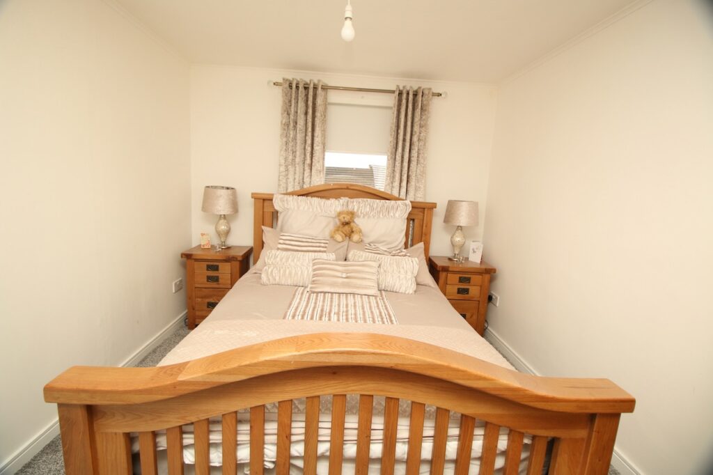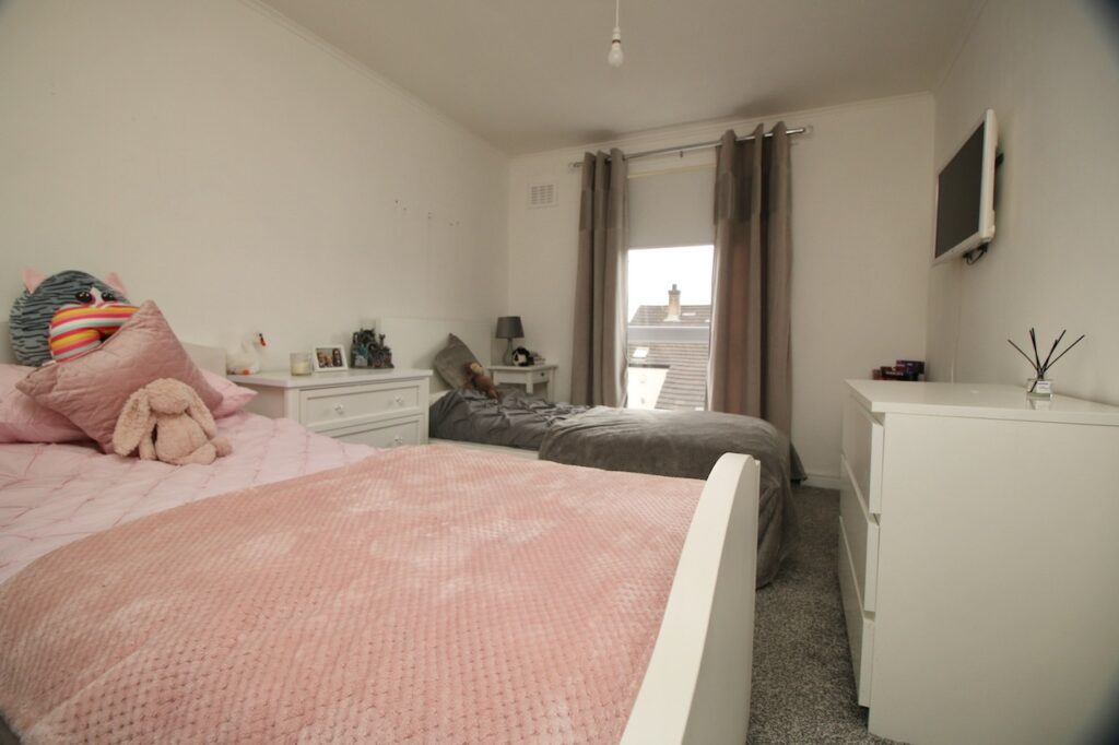 On the upper level, the light and airy hallway leads to impressive two double bedrooms which are pleasing to be in and offer good size accommodation and great storage. The family bathroom has been recently upgraded and provides full height wall tiling with matching floor tiles to compliment this area, along with walnut style vanity furniture with bath and overhead waterfall shower.
