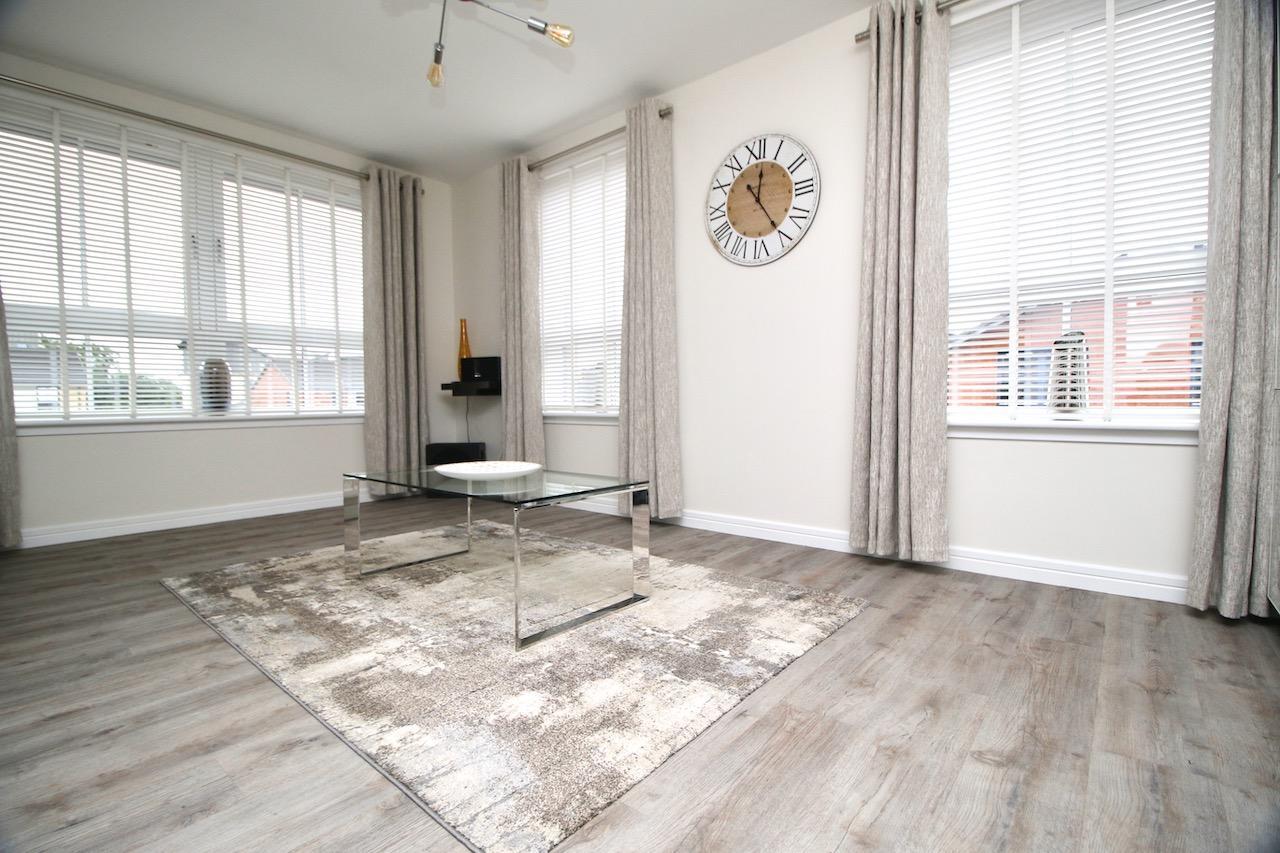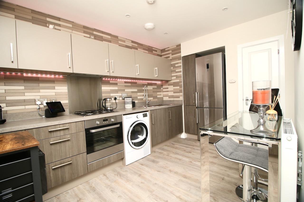 The inviting hallway provides access to all accommodation on offer and boasts excellent storage with two separate storage cupboards. The open plan lounge/kitchen offers a perfect space for modern living and entertaining. When you enter the lounge you will be immediately impressed by the double aspect windows which flood the room with natural light and have outstanding open views.The stylish kitchen has been fitted with an excellent range of base and floating wall units and comes complete with stunning wall tiles from workspace to ceiling, this area also has the perfect space for morning coffee.The kitchen appliances which include gas hob, oven, washing machine and fridge freezer are also included in the sale.
