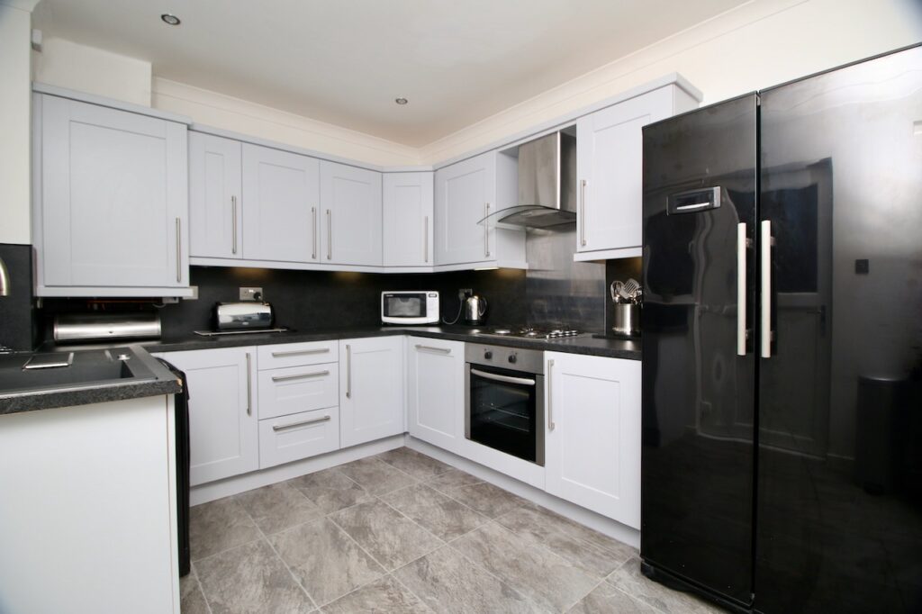 On the upper level the hallway leads to two well proportioned bedrooms, which both include wardrobe storage, and family bathroom. The family bathroom has been recently upgraded and provides full height wall tiling with matching floor tiles, overhead modern shower, white bath, white gloss vanity furniture and chrome towel rail.