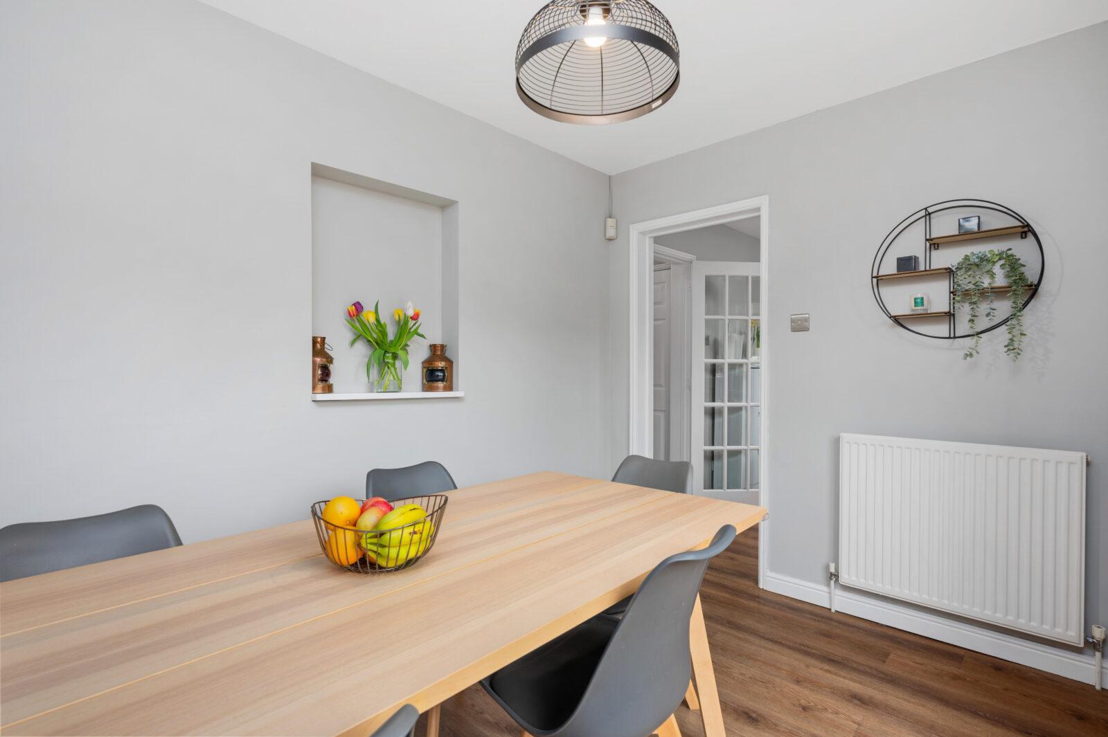 A welcome reception hallway gives access to all accommodations on the lower and upper floor. As you enter the bright lounge will be immediately impressed by the generous size of the room, with feature bay windows which flood the room with natural light. The modern kitchen has been fitted with an excellent range of base and wall units complete in Anthracite grey with 5 burner gas hob, double oven, built in microwave complete with feature splash back and chrome accessories. The kitchen also has convenient side door access leading to the rear garden. The spacious dining area is a fabulous place for formal dining or entertaining with patio door access that looks out onto the rear garden. To complete the ground floor accommodation is a contemporary WC complete with wash basin, feature mosaic wall tiling with white gloss vanity furniture and excellent storage.