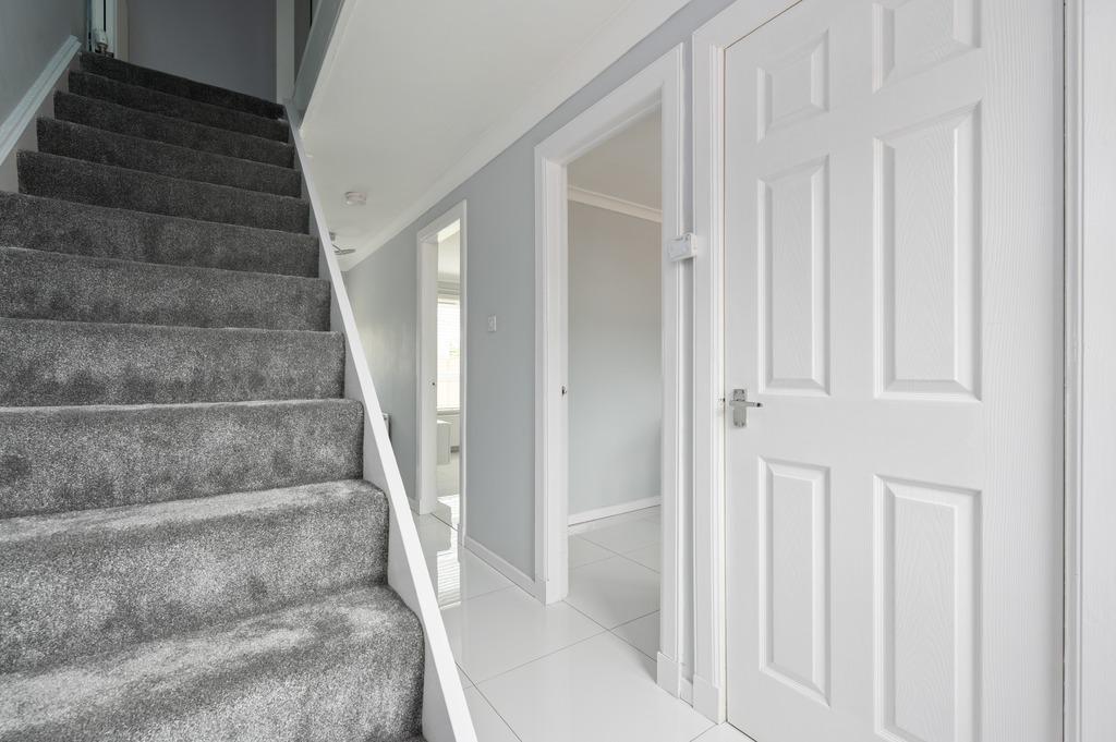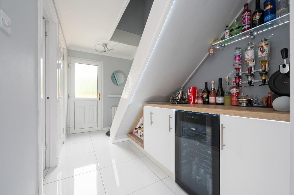 On the ground floor, a welcoming entrance hallway with two useful storage cupboards leading to a bright and spacious lounge overlooking the front garden, and a contemporary kitchen diner fitted with a good range of base and wall units, complemented by an under-stair bar and ceramic tile flooring throughout.