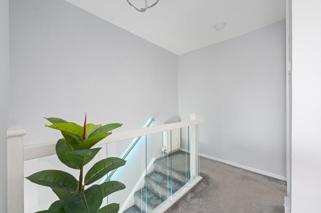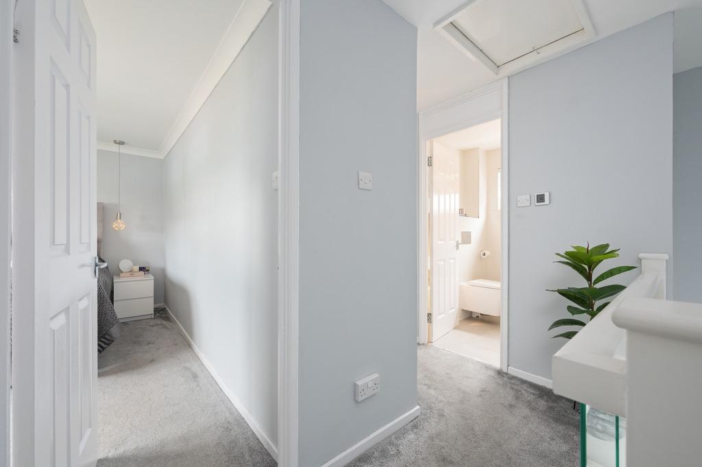 Upstairs, the upper landing is enhanced by a glass and wood balustrade and leads to two generously sized double bedrooms—one to the front with a large walk in wardrobe and a second to the rear overlooking the enclosed garden. The modern family shower room features modern vanity furniture and chrome towel radiator for that extra feeling of luxury.  A good sized storage cupboard completes the upper level.