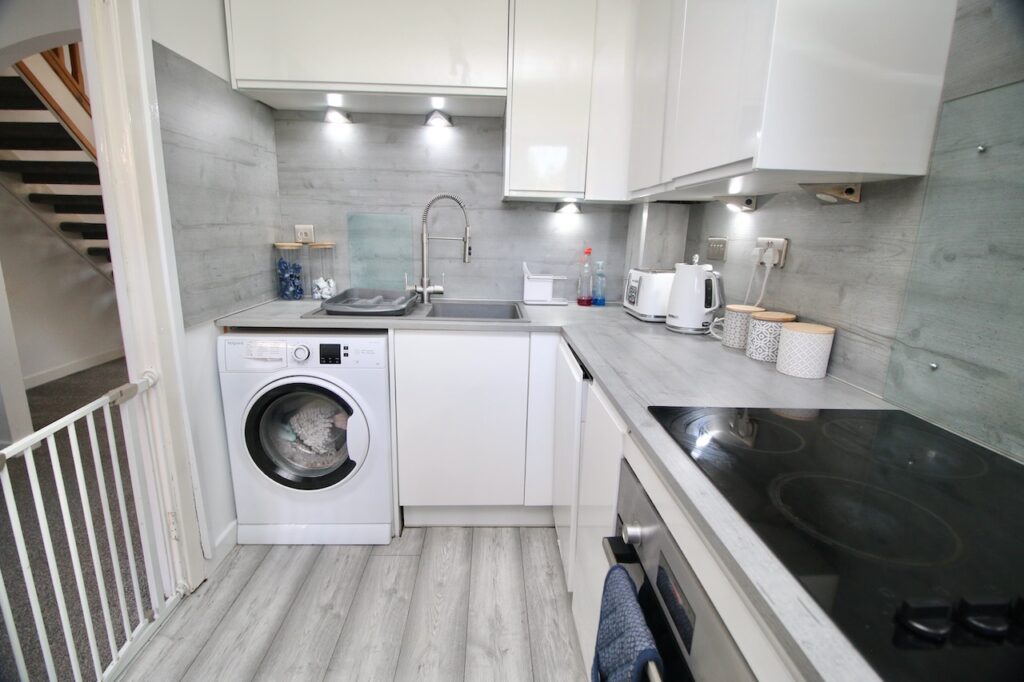 As you enter the property you are welcomed by the convenient vestibule which gives access to all accommodations on the lower and upper floor. As you enter the open plan lounge/dining room you will be immediately impressed by the generous size of the room with front facing double glazed windows which flood the room with natural light. The dining area is the perfect space for family mealtimes or entertaining with beautiful French Doors which access the rear garden. The contemporary kitchen has a good range of base and wall units making excellent room of the available space. The kitchen is complete with hob, oven, integrated fridge/freezer, dishwasher and washing machine which are included in the sale. The kitchen is finished with white gloss units, grey worktops, feature down lights and chrome accessories.