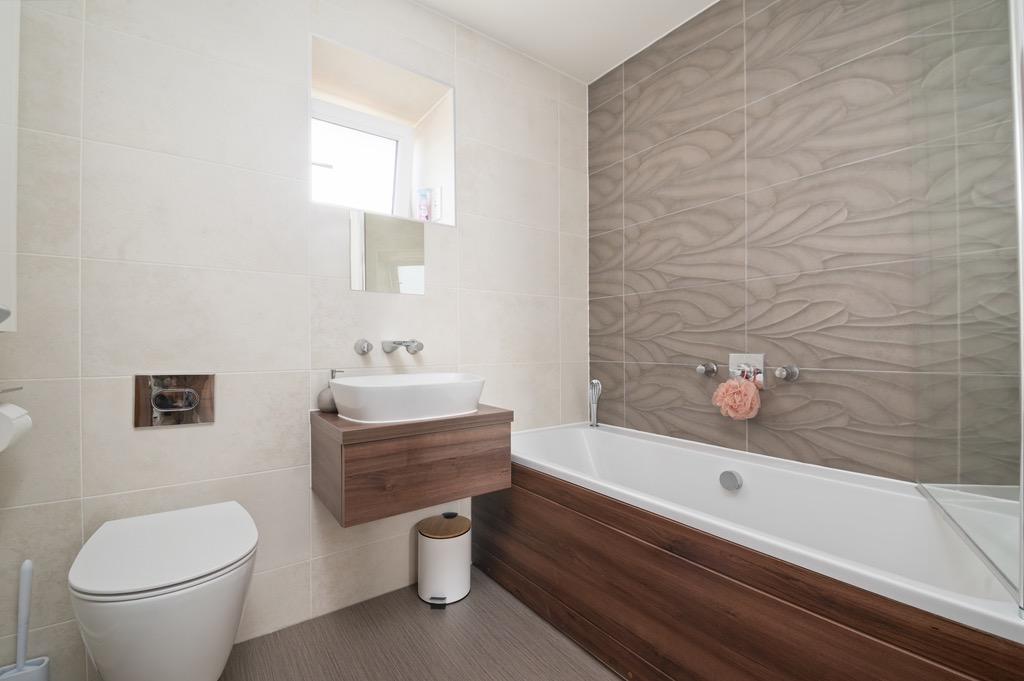 Upstairs, the master bedroom benefits from fitted wardrobes and a sleek ensuite, while bedroom two—overlooking the rear garden—also includes a fitted wardrobe. Two additional well-proportioned bedrooms are situated at the front of the property. The contemporary family bathroom is finished with high-quality Porcelanosa tiling and a stylish feature wall. Additional storage is provided by a further upstairs cupboard.